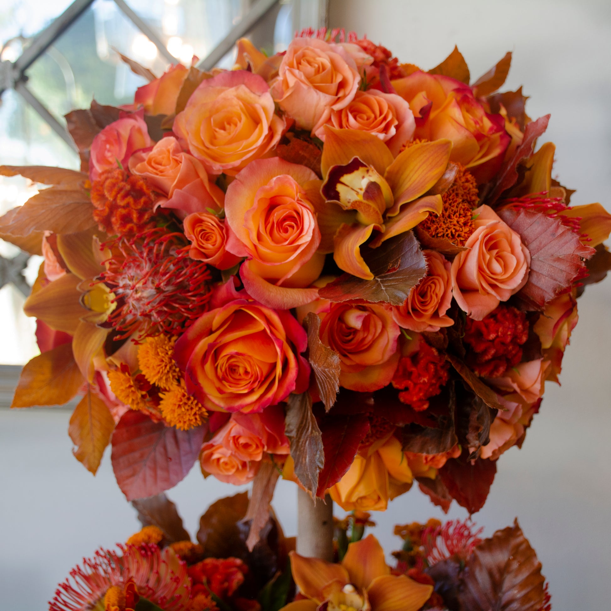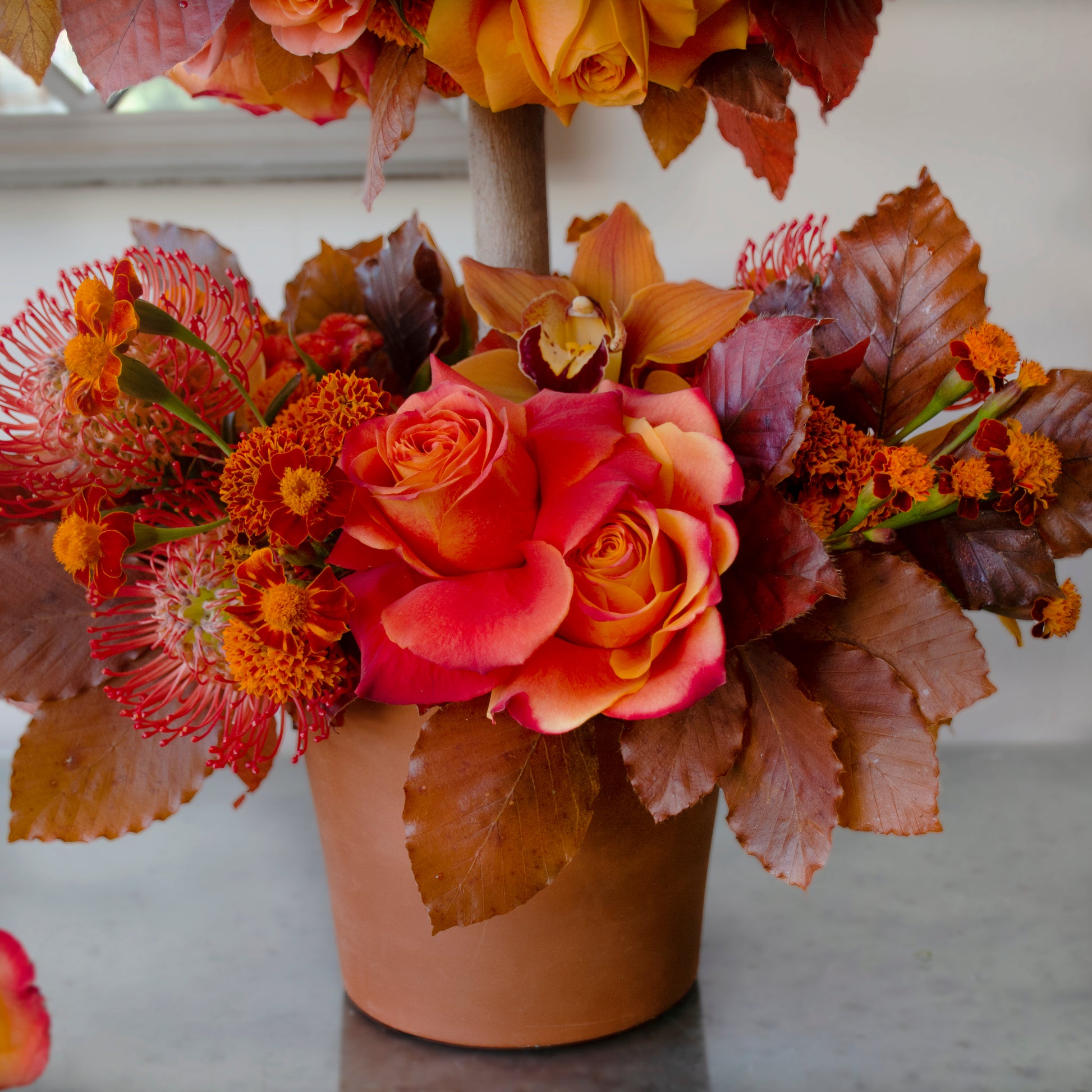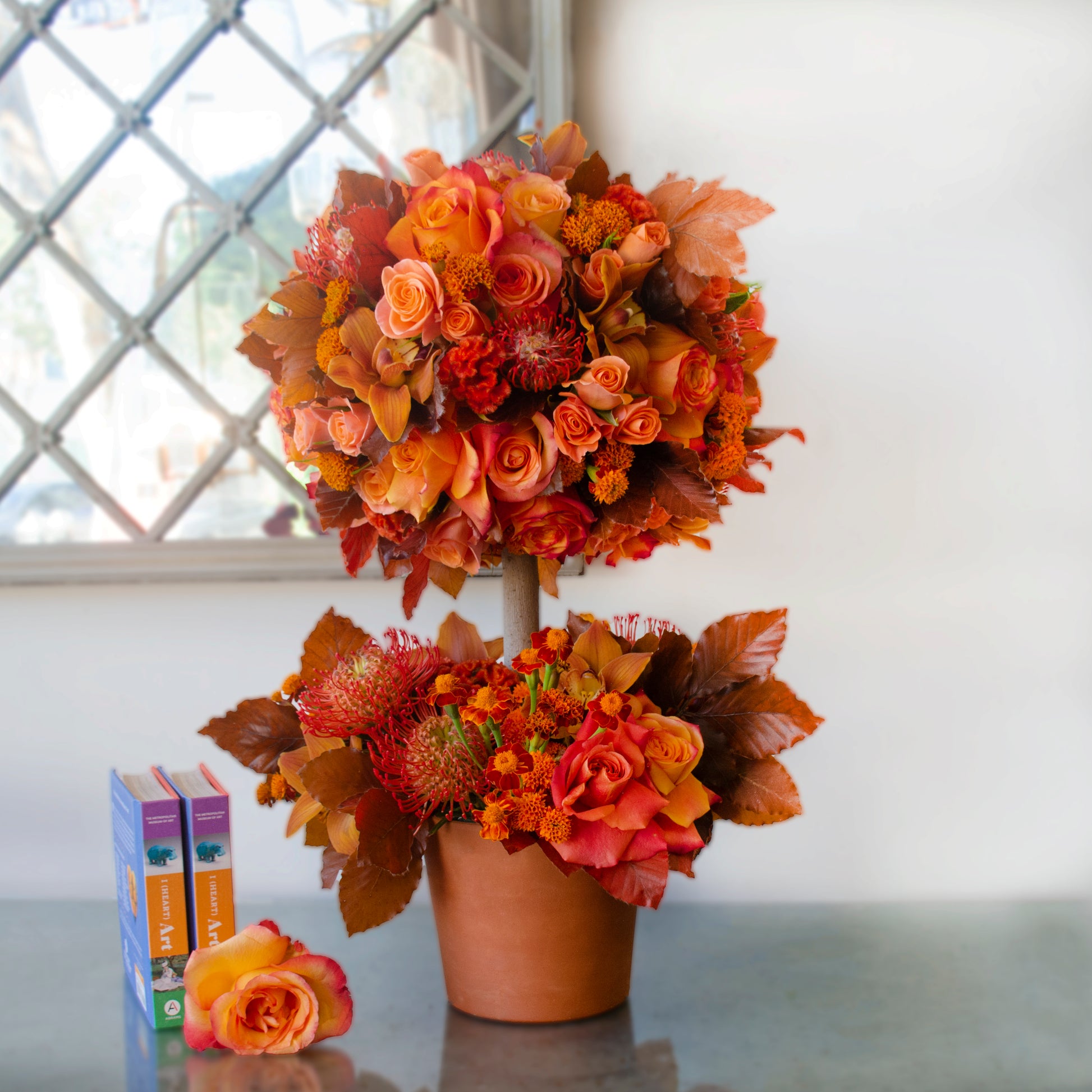 Immerse yourself in the vibrant hues of our latest creation—a stunning topiary tree ablaze with rich, fiery tones. This exquisite composition boasts a captivating blend of ombre orange roses, soft light orange roses, fiery orange pincushions, plush coxcomb, golden marigolds, and delicate cymbidiums, all elegantly accented with touches of autumnal leaves.