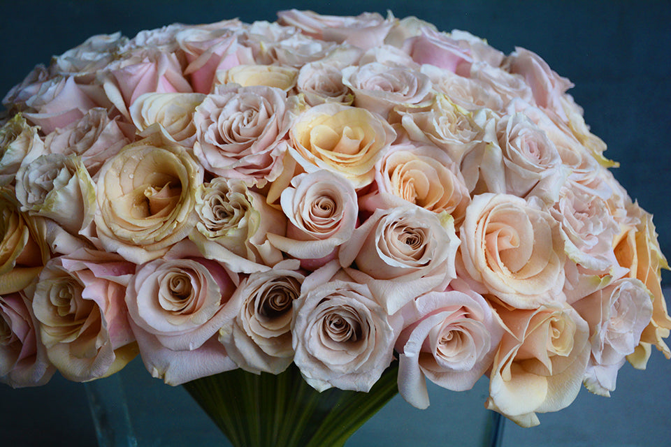 This stunning floral design offers you the perfect mix of mother of pearl and quicksand roses. 70 to 75 stunning blush roses bloom in every direction, while steel grass is shaped into a v at the base. Resting inside a 11” tall glass vase, overall this arrangement stands around 16” tall and 18” wide.