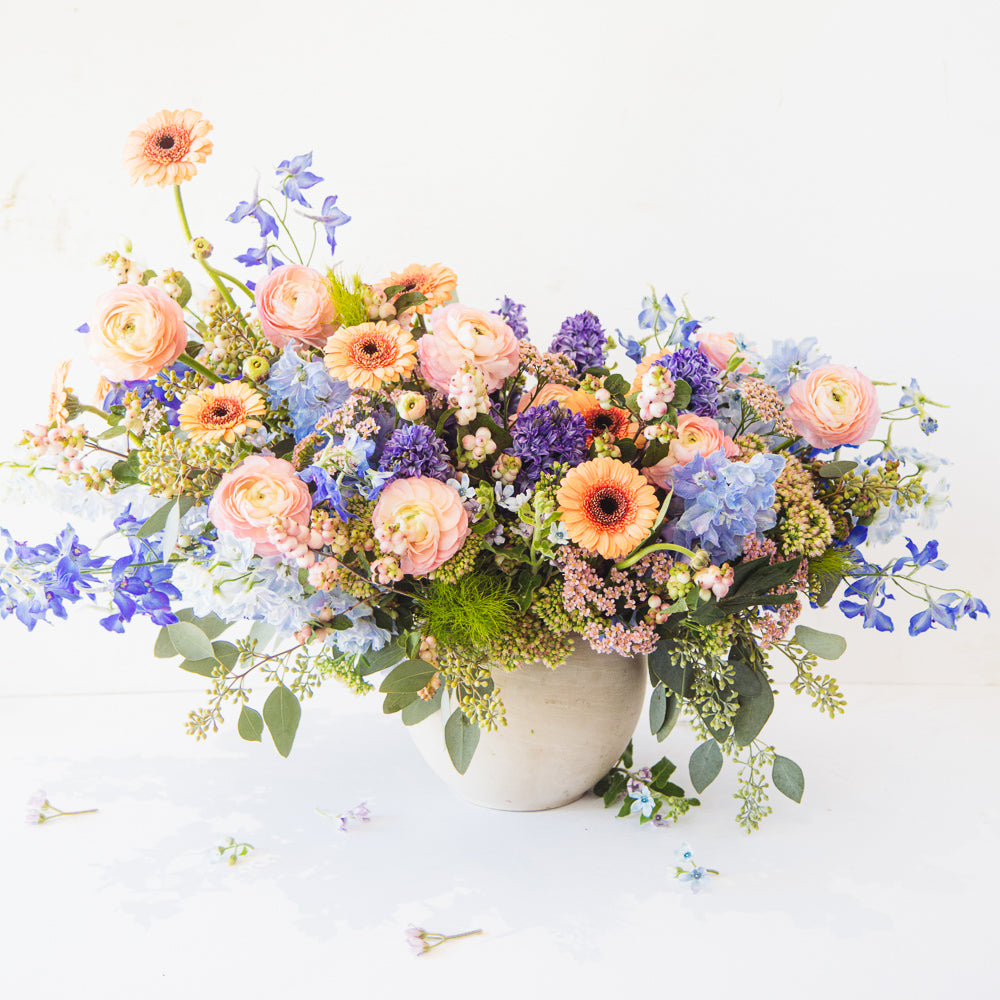 Awaken your senses with this incredible floral design. Peach daisies contrast the rich purple lilac and indigo hyacinth. Blush pink ranunculus and accents of green and soft pink blooms are placed throughout. This arrangement rests inside a rustic 10” ceramic vase.