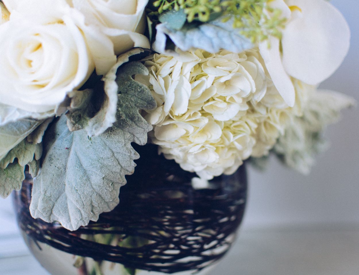 Crisp and fresh, this stunning new design consists of artfully arranged white roses, eucalyptus leaves, and silvery grey dusty miller. Twined victorian birch can be seen submerged within the 6" tall glass fishbowl vase. Overall, this elegant arrangement stands at approximately 13" tall overall.