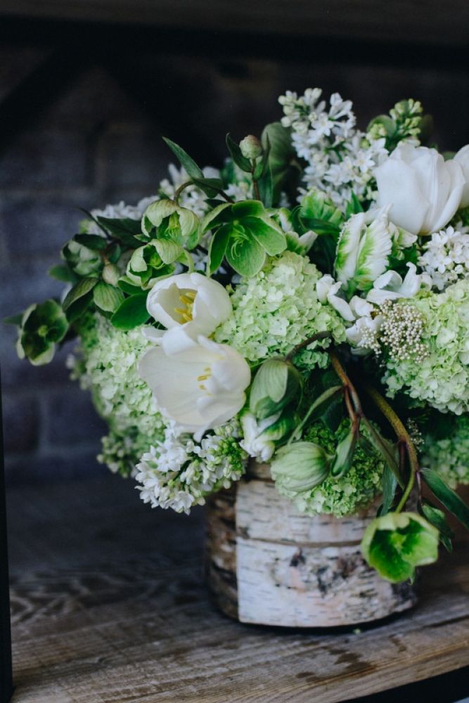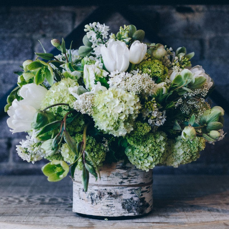 This fresh new design proves that emerald hues reign supreme. Crisp white tulips and bunches of white lilac provide a stunning contrast against vibrant lime green winter roses, rice flower, and hydrangea. Resting within a 7" x 7" cylinder vase lined with natural birch, this arrangement stands at approximately 18" tall overall.