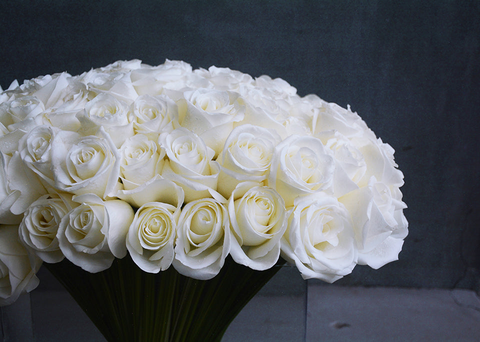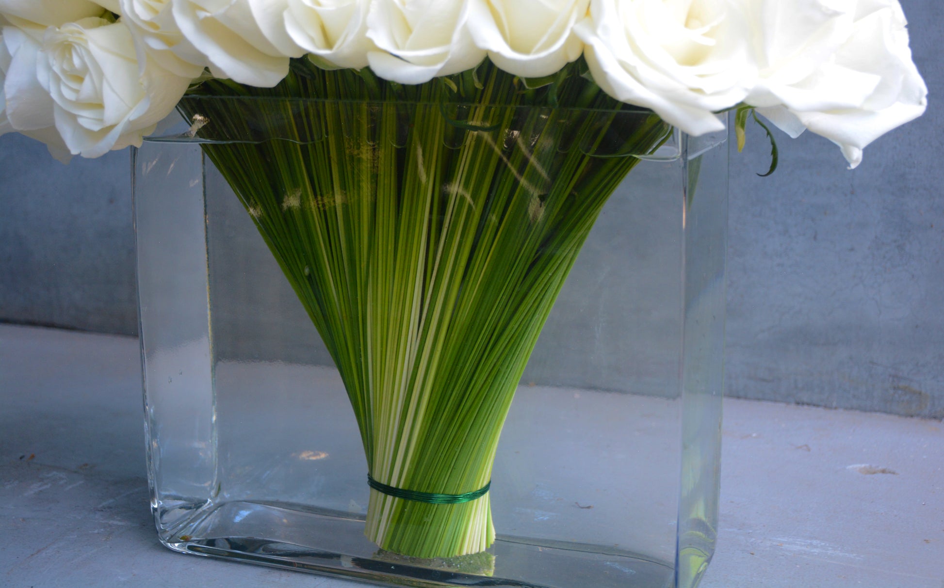 This stunning floral design offers you the perfect ivory roses and unique composition. 70 to 75 stunning white roses bloom in every direction, while steel grass is shaped into a v at the base. Resting inside a 11” tall glass vase, overall this arrangement stands around 16” tall and 18” wide.