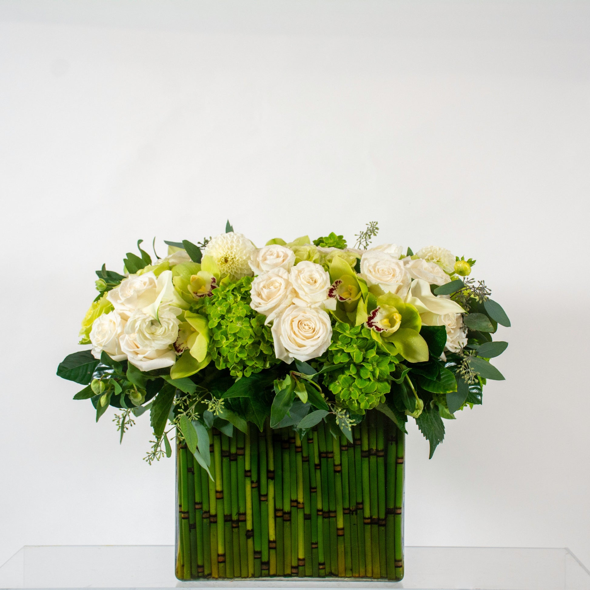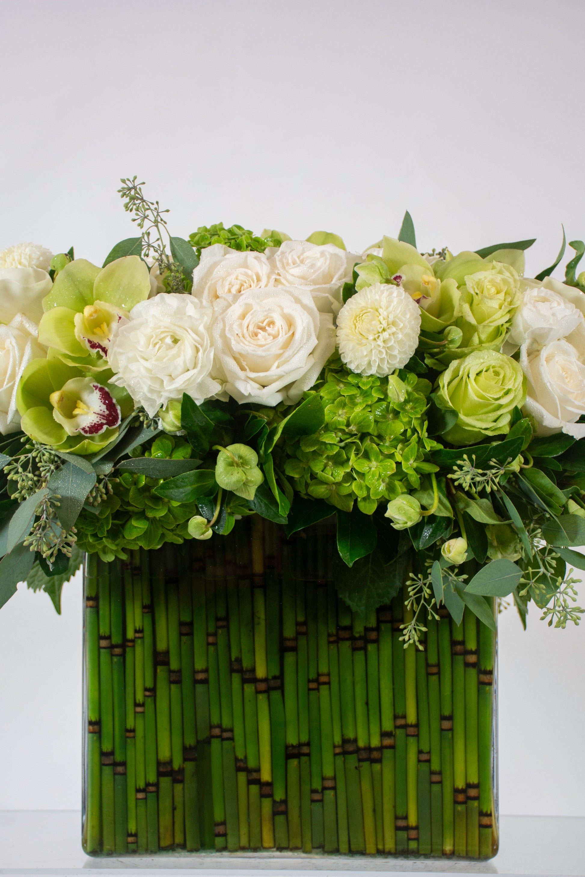 Nestled in a glass vase lined with bright bamboo stems, this green and white arrangement brings a touch of countryside elegance indoors.