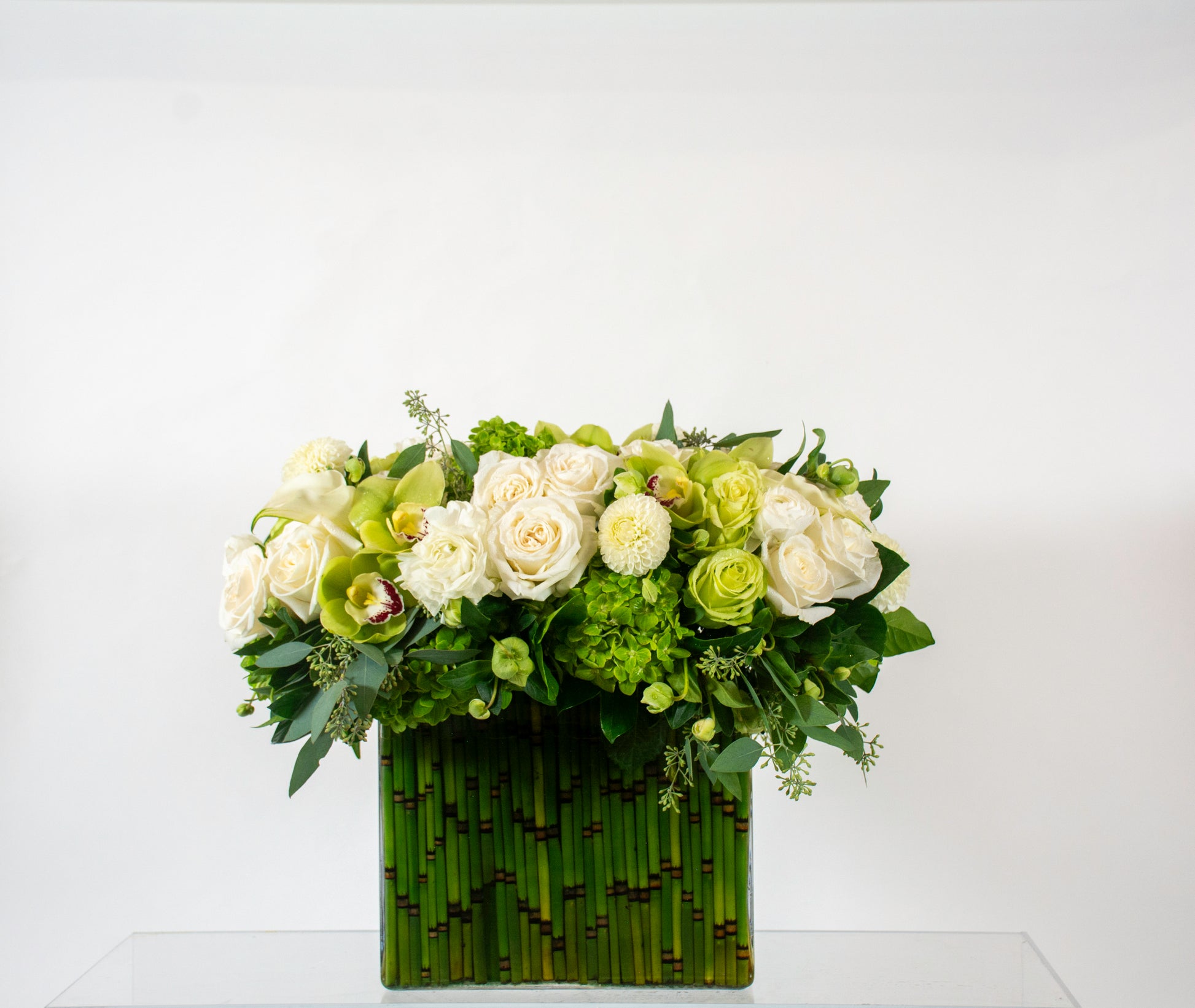 Madison Meadow captures the essence of a secret garden with creamy white Roses alongside soft Dahlias, ivory Calla Lilies, and lush green Hydrangeas. Playful pops of green Cymbidium Orchids add charm to this fresh composition.
