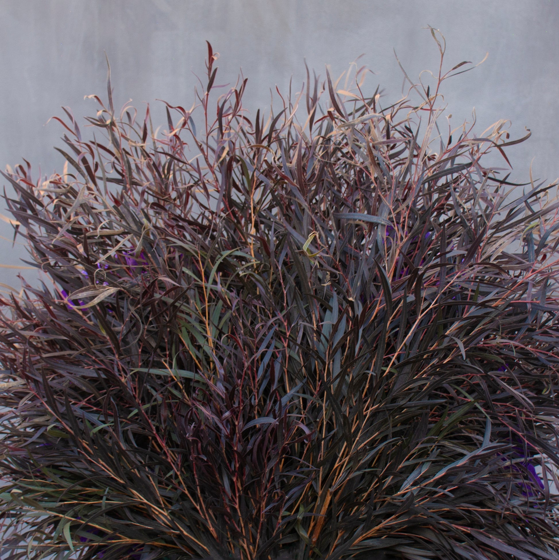 A striking display of elegance and depth, Midnight Peacock commands attention with its moody, fan-like silhouette. Deep burgundy foliage sweeps upward like the regal tail of a peacock, setting the stage for a dramatic cluster of near-black calla lilies—sleek, mysterious, and full of allure. Flanking this velvety darkness, two fans of vibrant purple vanda orchids unfold in perfect symmetry, their delicate petals offering a mesmerizing contrast. Nestled in a bold black pedestal vase, this arrangement is a statement of sophistication spanning at 21 inches tall and 23 inches in width.