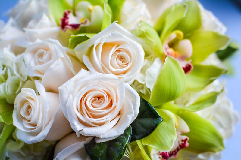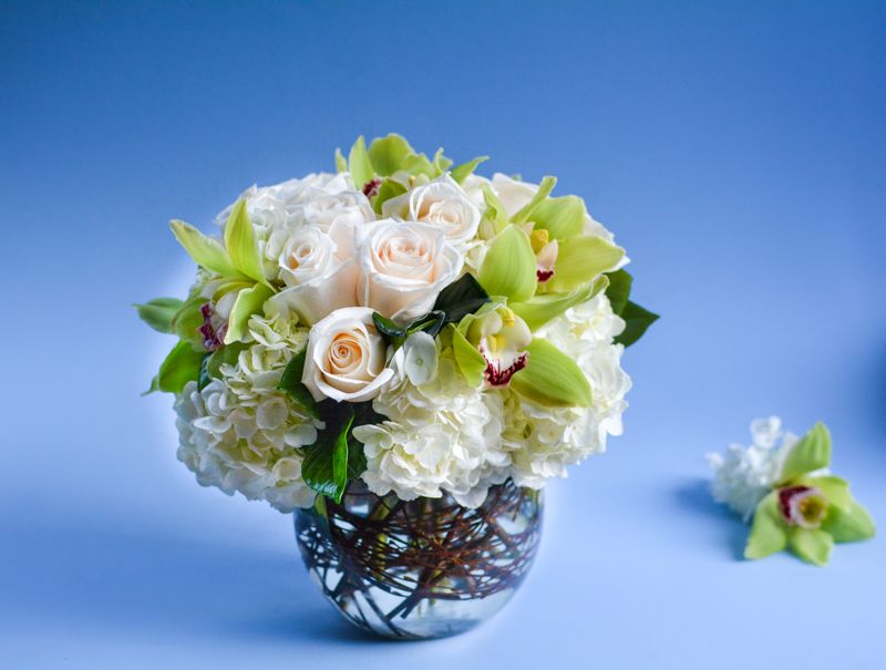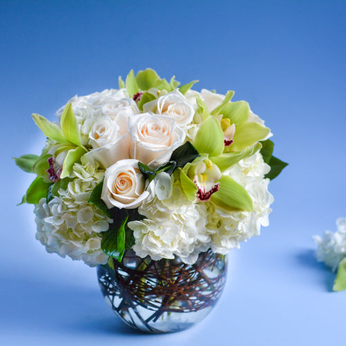An elegant mix of all white and green is appropriate for many occasions.This arrangement is in a 6" fishbowl and includes roses, orchids and seasonal flowers. Total arrangement approx 8" in diameter.