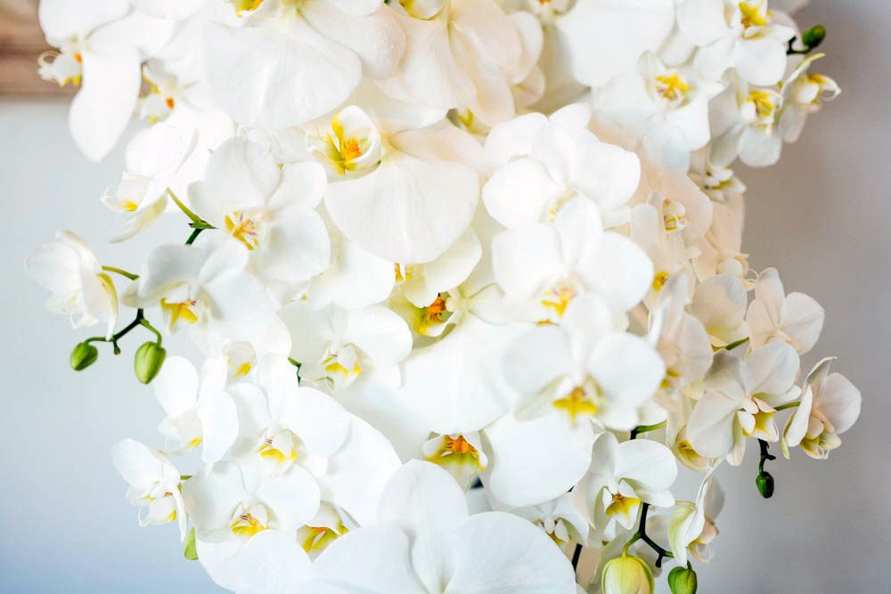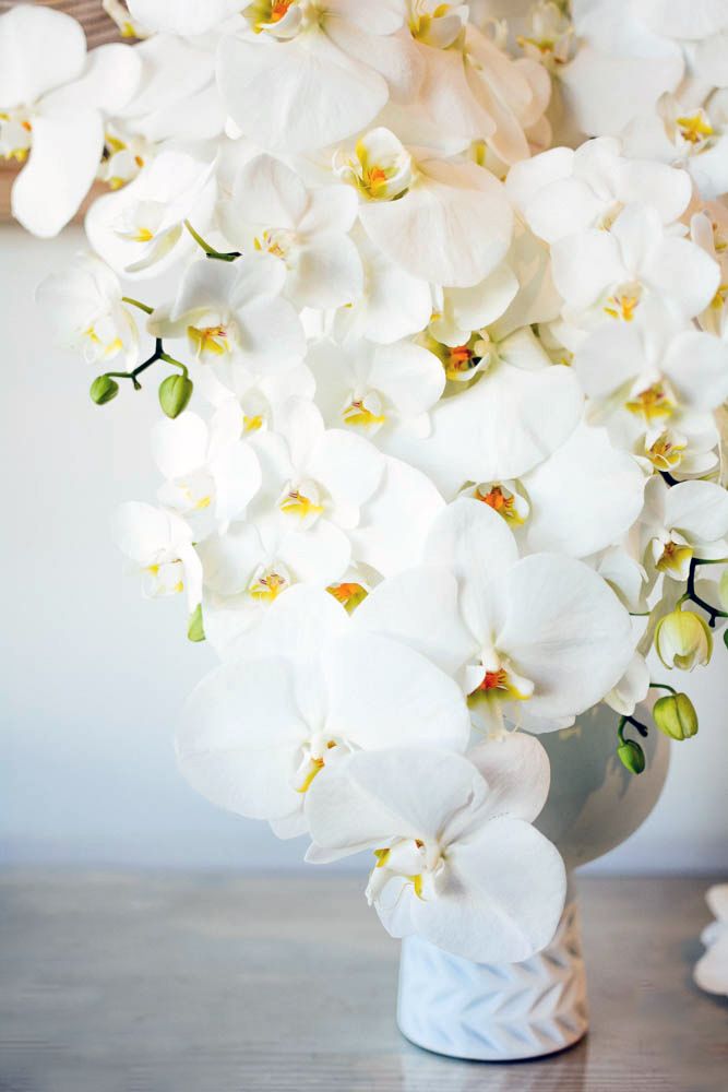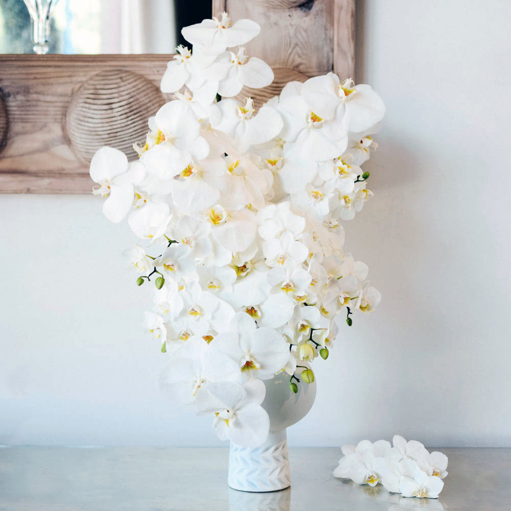 This monochromatic floral design features a a chic tower of cut phalaenopsis orchids and miniature phalaenopsis orchids.  White orchids have long symbolized elegance and beauty, and this structural arrangement is no exception! Standing tall from within a 12" tall white designer vase, "Orchid Ikebana" measures approximately 29" tall overall.