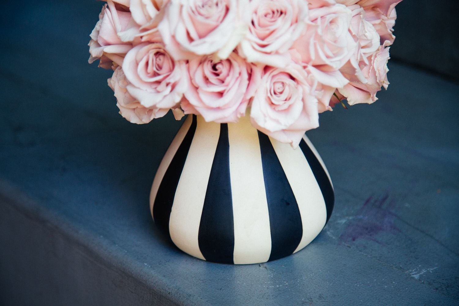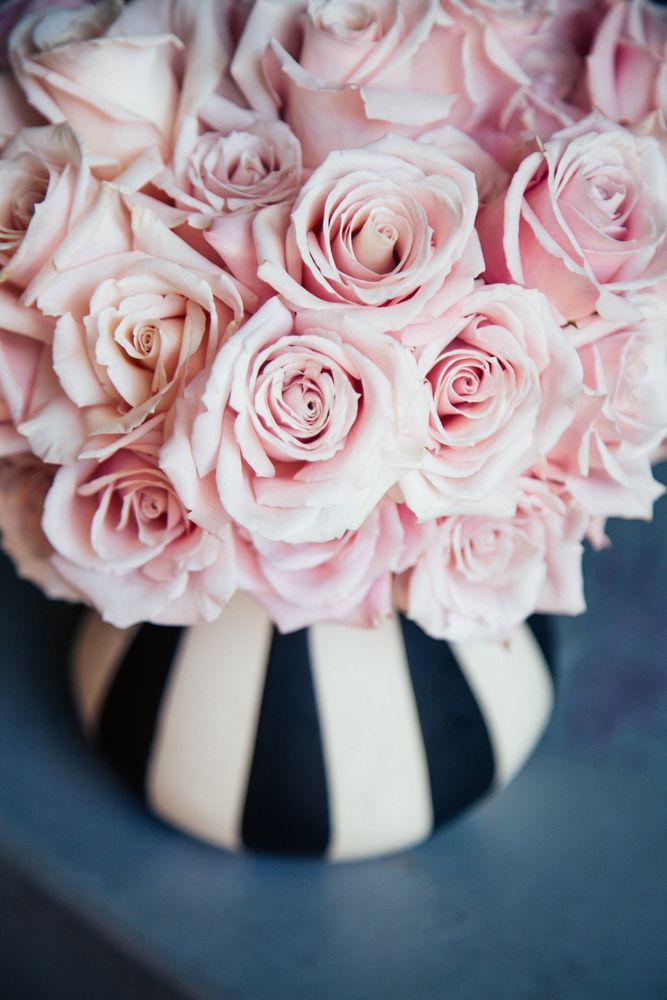 Take in the classic beauty and ageless grace of the 35 rose with this lovely floral design. Pastel pink roses are gathered together, resting inside a beautiful 6” black and white ceramic vase. Overall this arrangement stands around 11” tall.