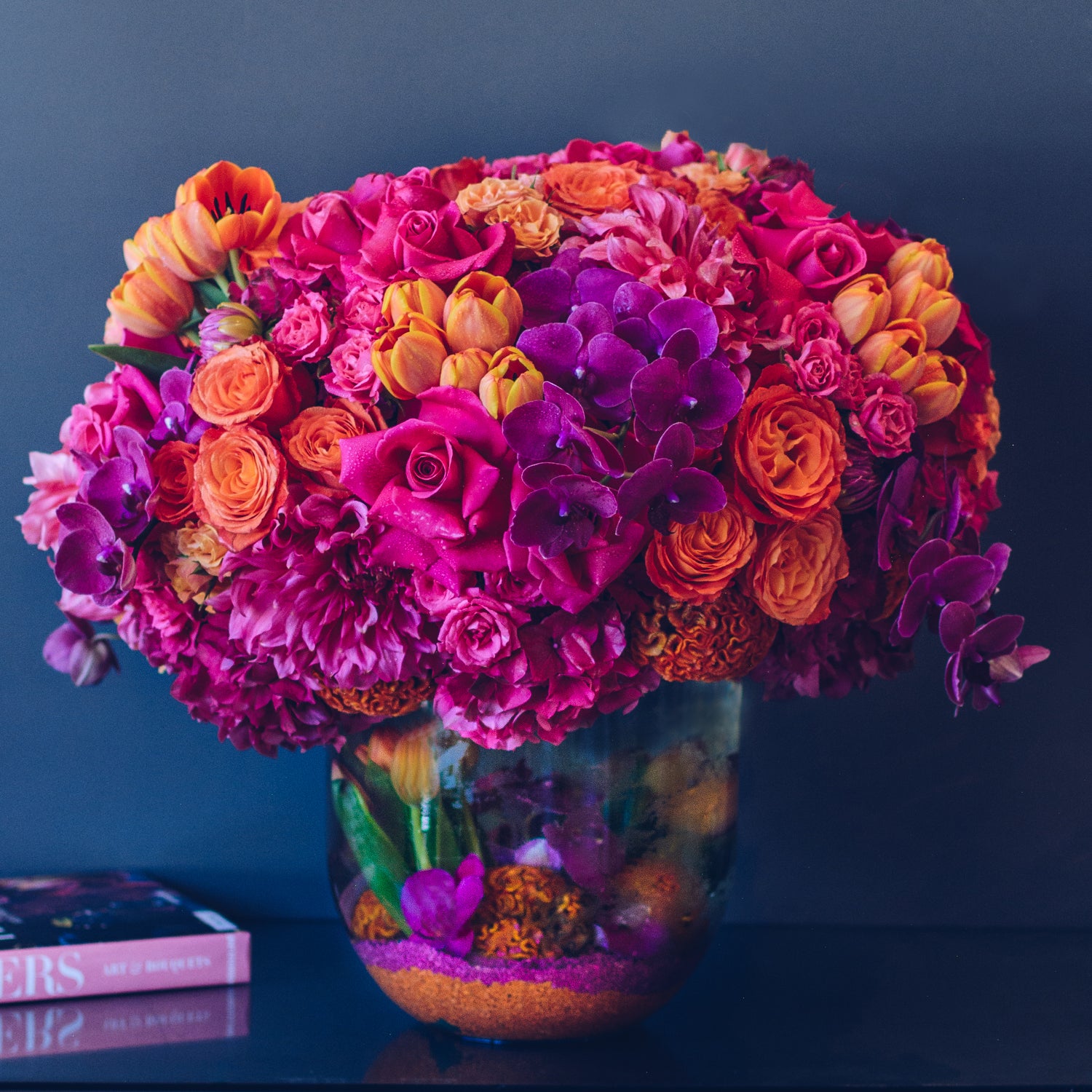 Delight in this rich jewel toned dual design, which features both a lush bouquet as well as a unique underwater scene. On top, tropical flair is expressed through an exquisite abundance of hot pink hydrangeas, hot pink dahlias, hot pink roses and spray roses, and vibrant orange tulips. In the vase below, tulips, orchids, and uniquely textured coxcomb all rest submerged underwater in a large tapered 11" by 11" cylindrical glass vase. Overall, this magnificent new design stands at approximately 26" tall.