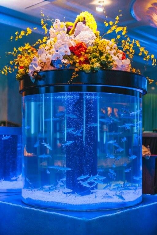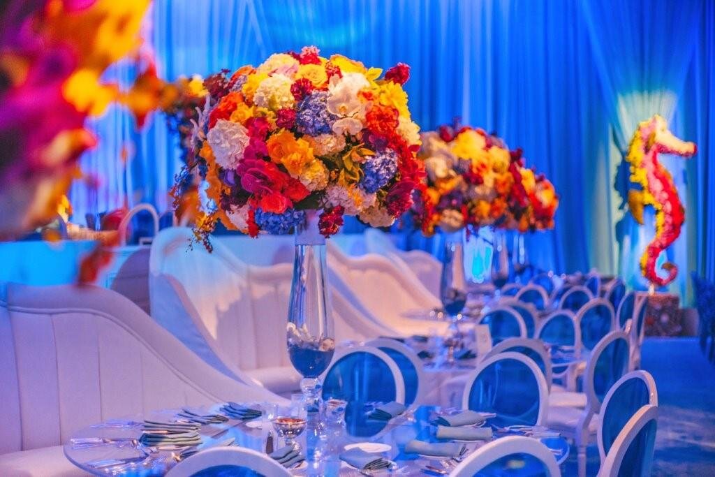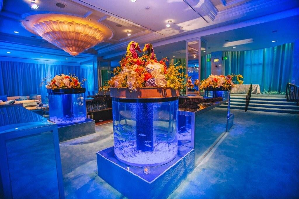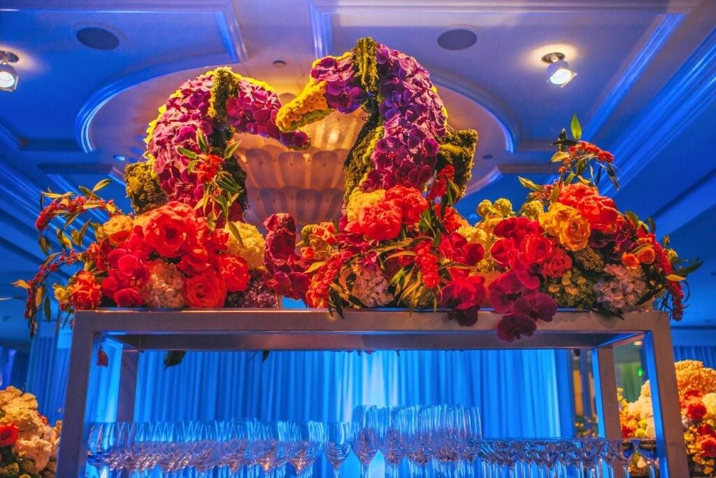 This aquatic themed Bar Mitzvah for a set of twin boys at the Beverly Wilshire was inspired by their love for surfing. This 700 person sit down dinner was enveloped by custom coral like centerpieces and seahorse topiaries covered in fresh flowers, as well as a gigantic octopus ceiling treatment and features of tanks with baby sharks at the bar. This certainly was an “under the sea” extravaganza.
