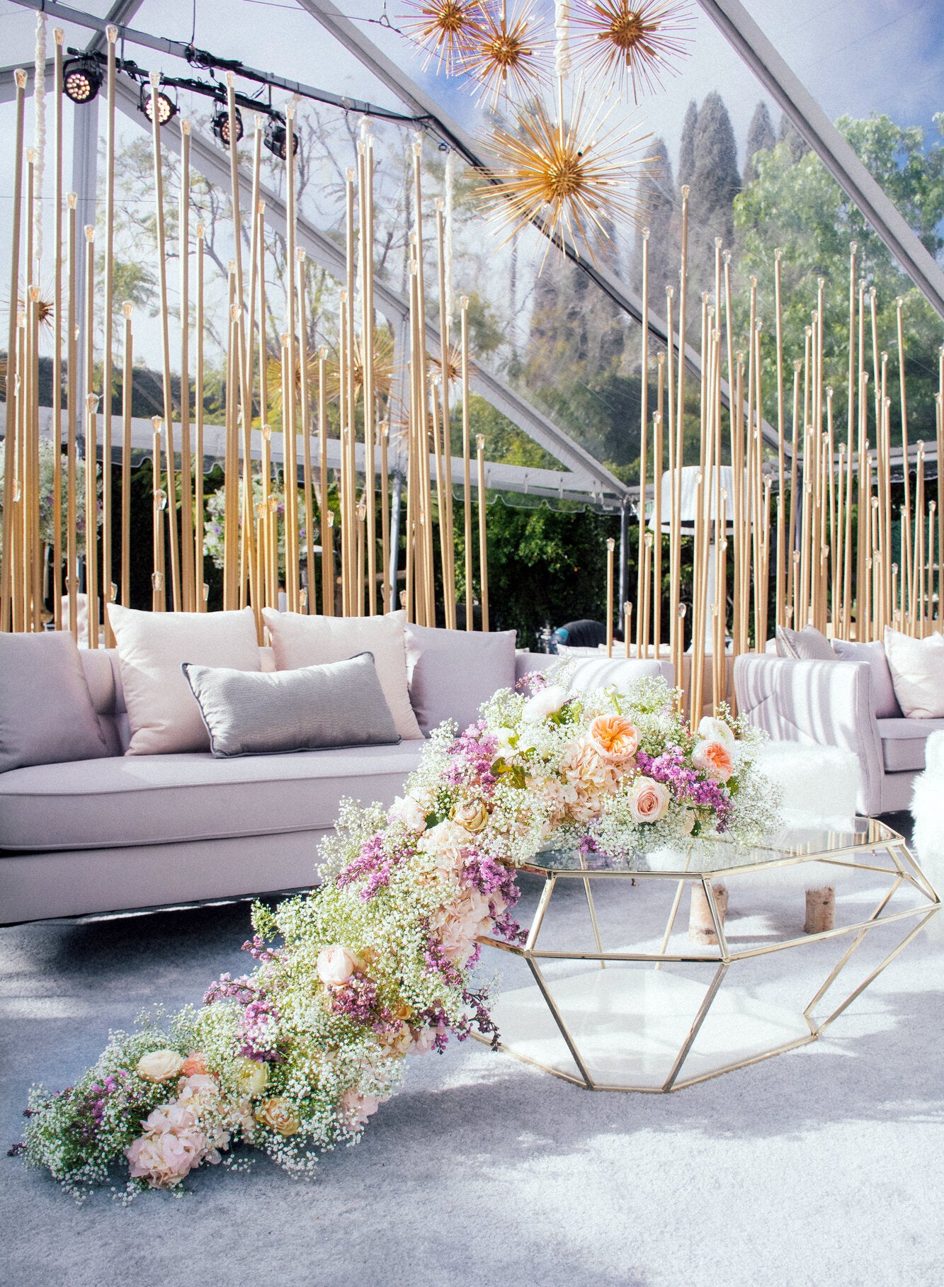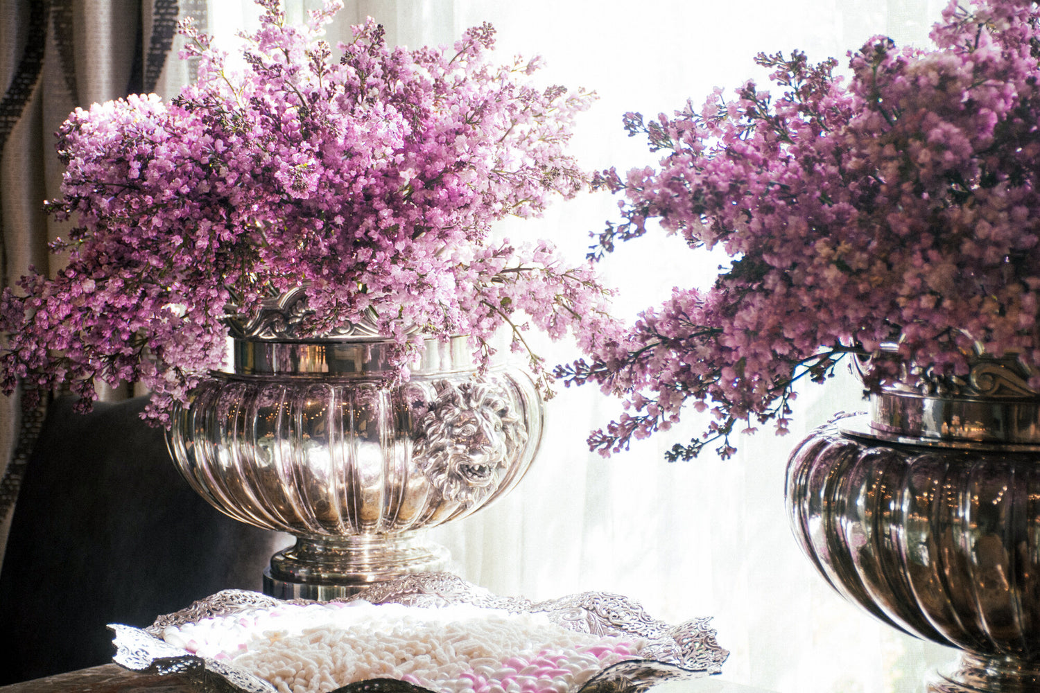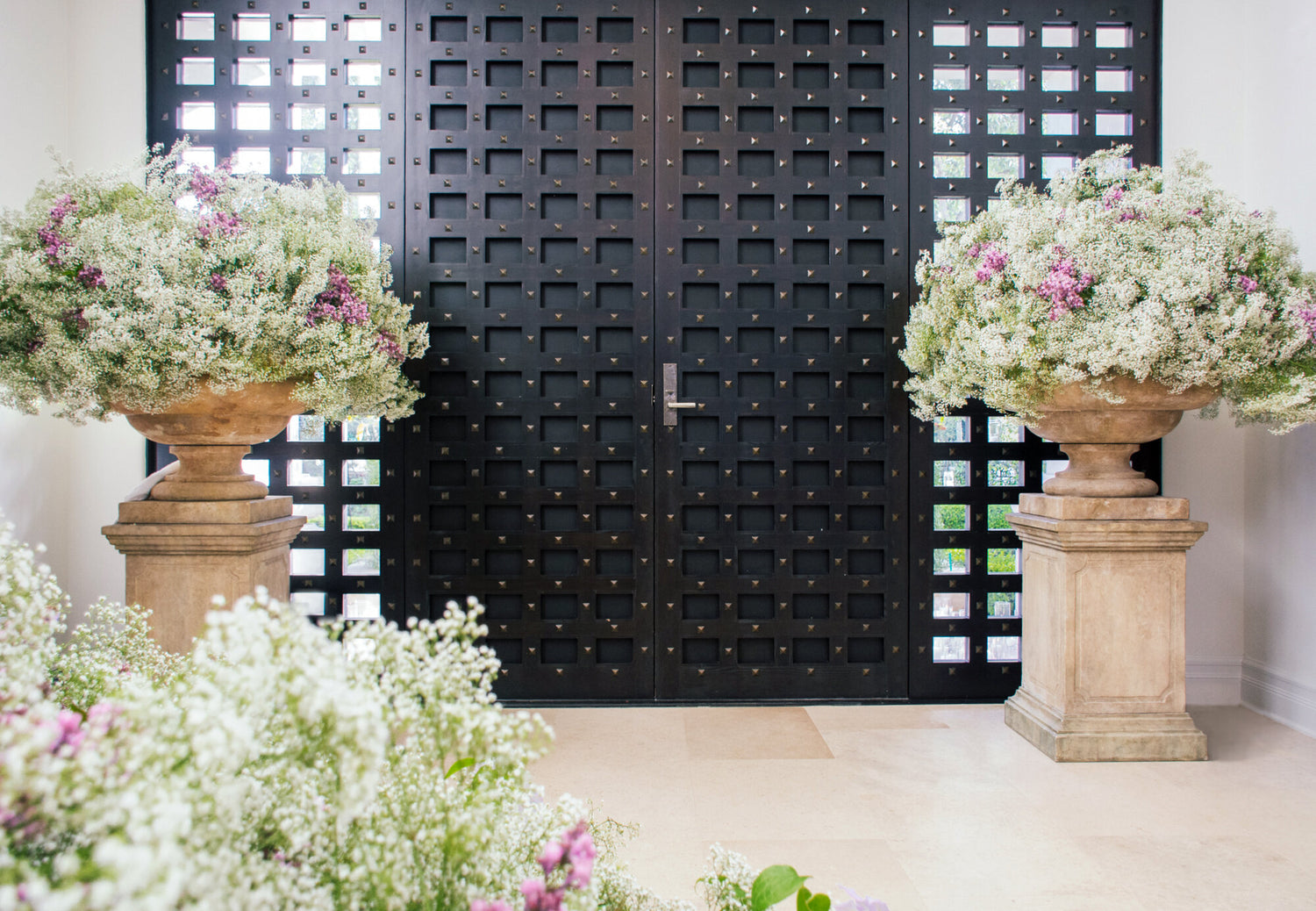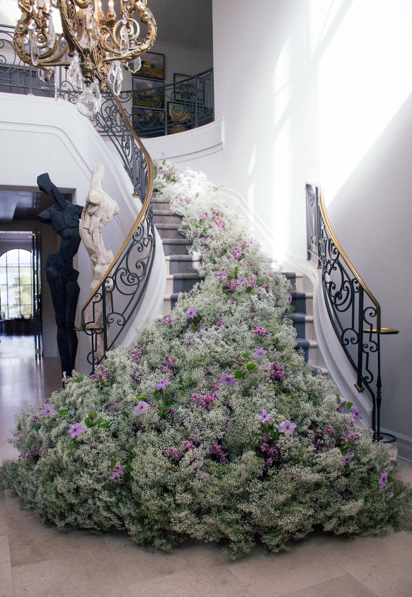 For this sentimental engagement, the bride and groom, who have been a part of the Empty Vase community for a long time trusted us to take their ideas and create something uniquely ours. We flowed off of the clients excitement around creating lush environments that created zones with Baby’s Breath and Moss. There were two areas in particular that we created whimsical and visually pleasing partitions to enchant the space while guiding the guests throughout the event. First the bride and groom wanted to emphasize the grand staircase by creating a show stopping display to wow the guests as they first enter the engagement party by creating this cascading design of baby’s breath and purple blossoms. The Second was a stunning wall divider to give the catering staff a zone to prep that kept them separate from where the guests enjoyed the event. We also created an activation of a swing for the bride and groom and their guests to have a spot to take photos to remember this special day.