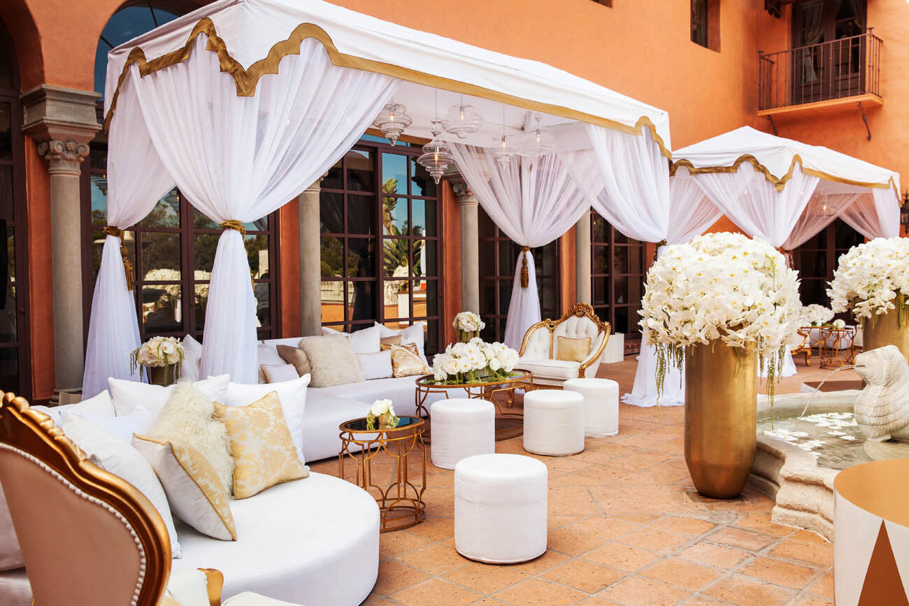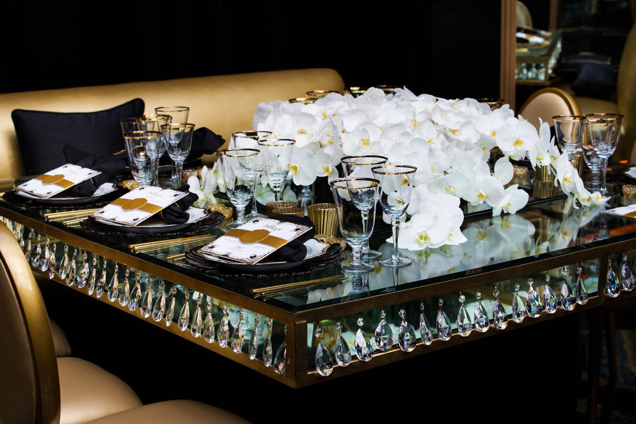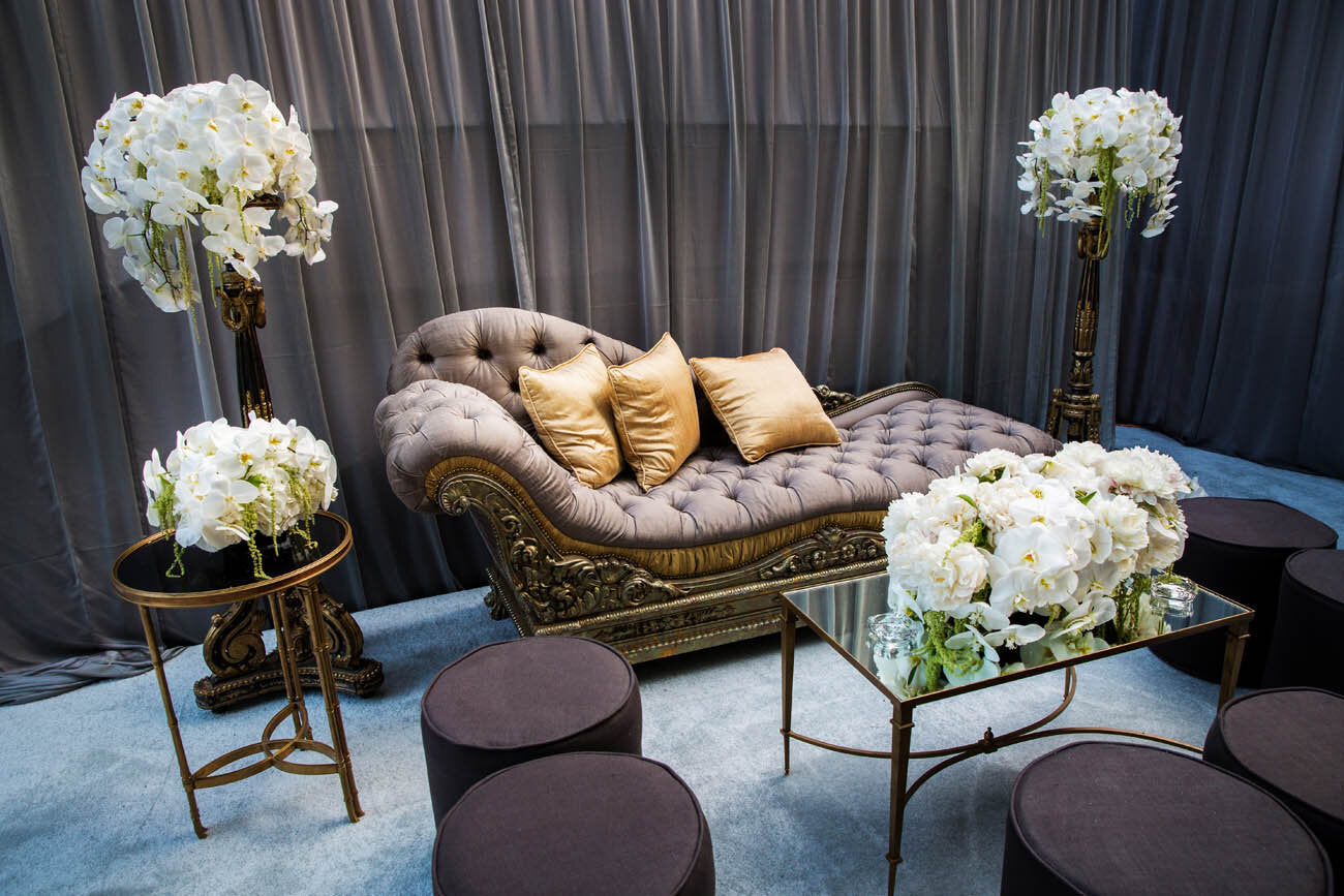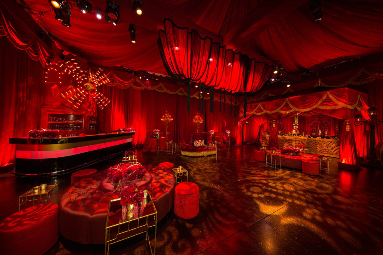For this extravagant and eclectic birthday party, the guest of honor, who is depicted in the paintings adorning the walls, wanted to create a journey for her guests. The guests started their night in an all white space for a radiant cocktail hour, before entering the mesmerizing black and white dining area embellished with gold details and crystal chandeliers. After a decadent meal, the guests had two more party zones, all four of which were built from ground up on the hosts tennis courts. The two part after party started with a vibrant red lounge area, before the after after party in a rich green room.