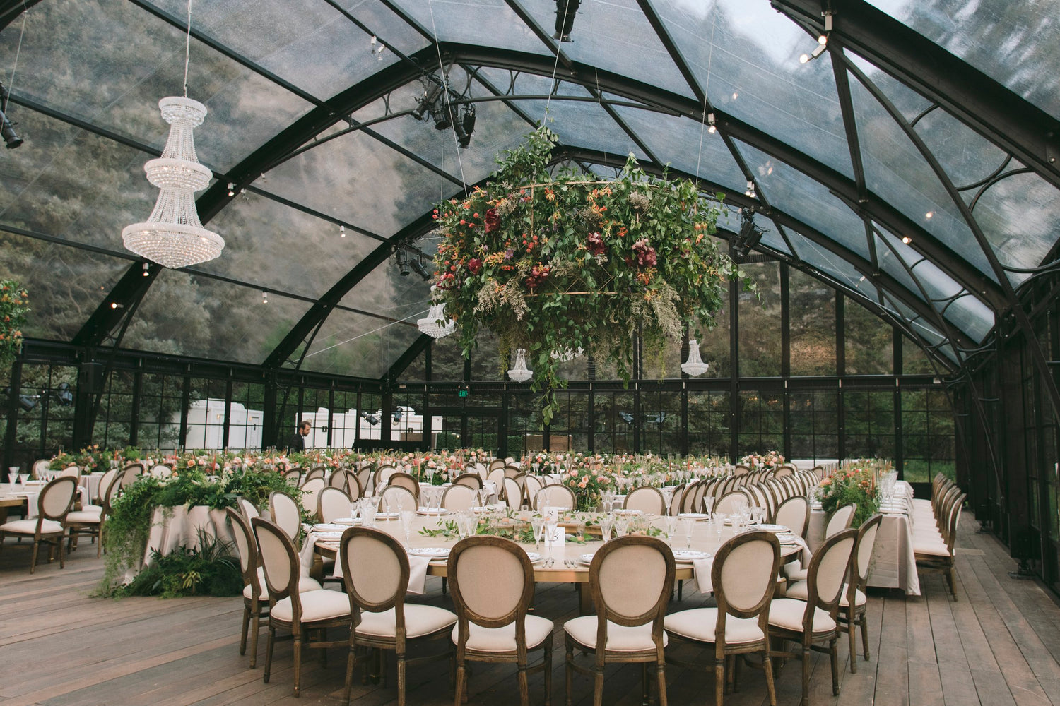 This wedding was unstoppable, through mudslides and thunderstorms, the days leading up to this nuptial were challenging but the love of the bride and groom brought peace and ease. One of the most unique features of this stunning outdoor wedding in Aspen, Colorado was the 24 foot tall, 36 foot wide and 16 foot deep geometric Chuppah that was custom built and took a semi truck to transport through the elements. After the unforgettable ceremony, guests enjoyed the evening in an elegant and enchanting greenhouse embellished with hanging greens and crystal chandeliers.