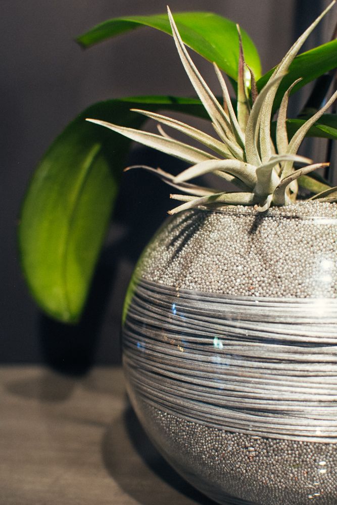 A single phalaenopsis stem rests within a 6" tall circular vase, filled to the brim with layers of metallic silver sand and metallic silver middolino finished with the perfect accent of a tillandsia air plant. Orchid picured stands at 25" tall, with the arrangement standing at approximately 31" tall overall. Please note that orchid stems will vary in height.
