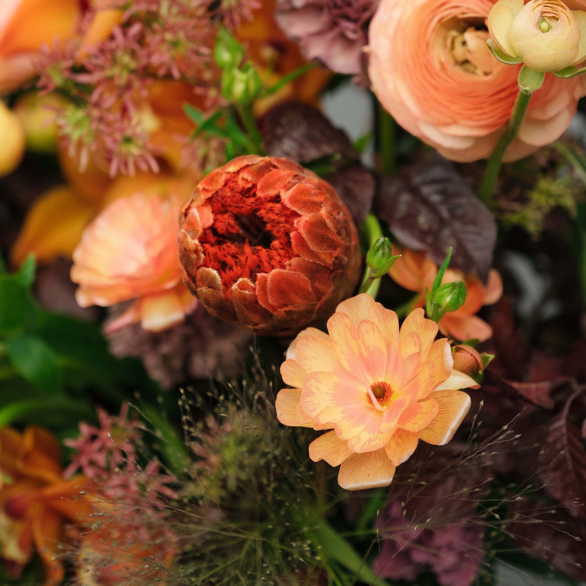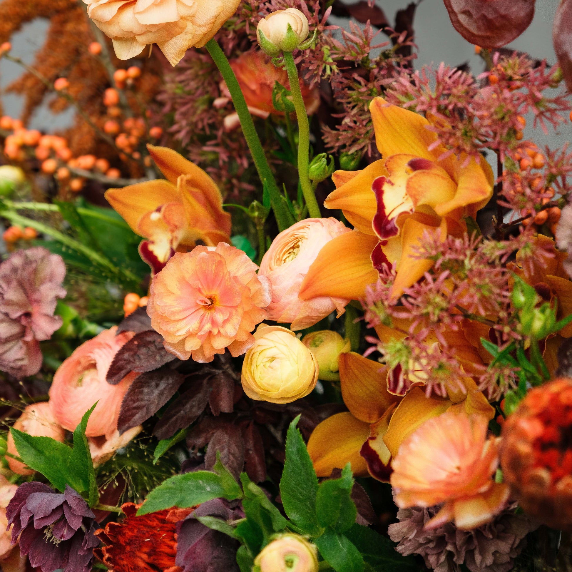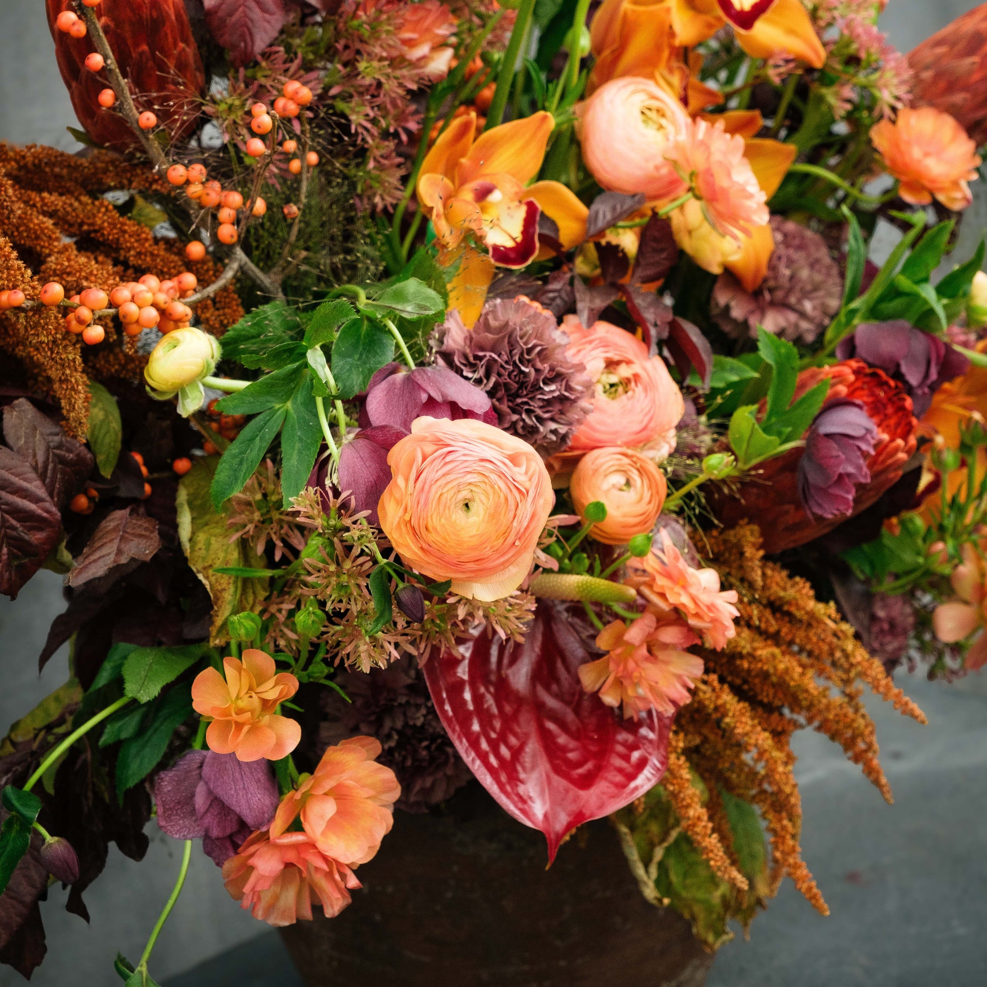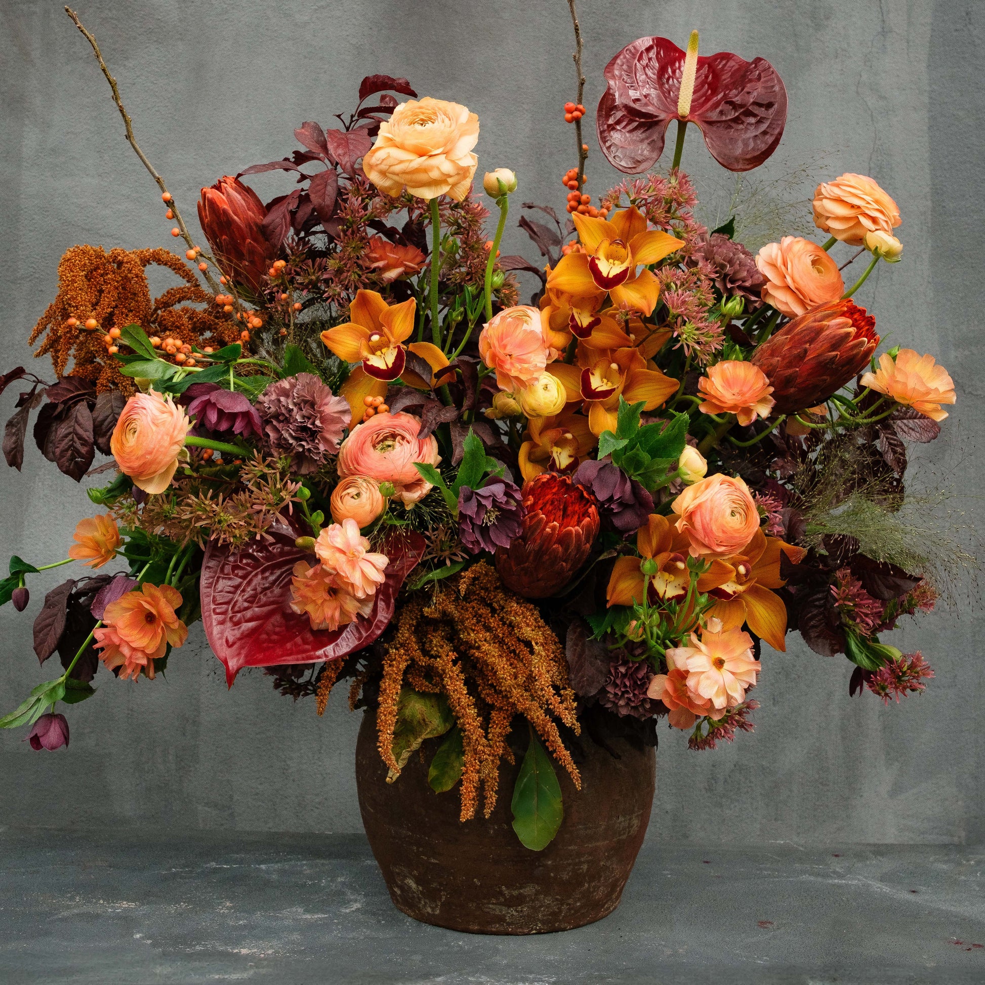 Cymbidium Orchids, Amaranthus, Ranunculus, Anthurium, Queen Protea, Butterfly Ranunculus, and Fall foliage