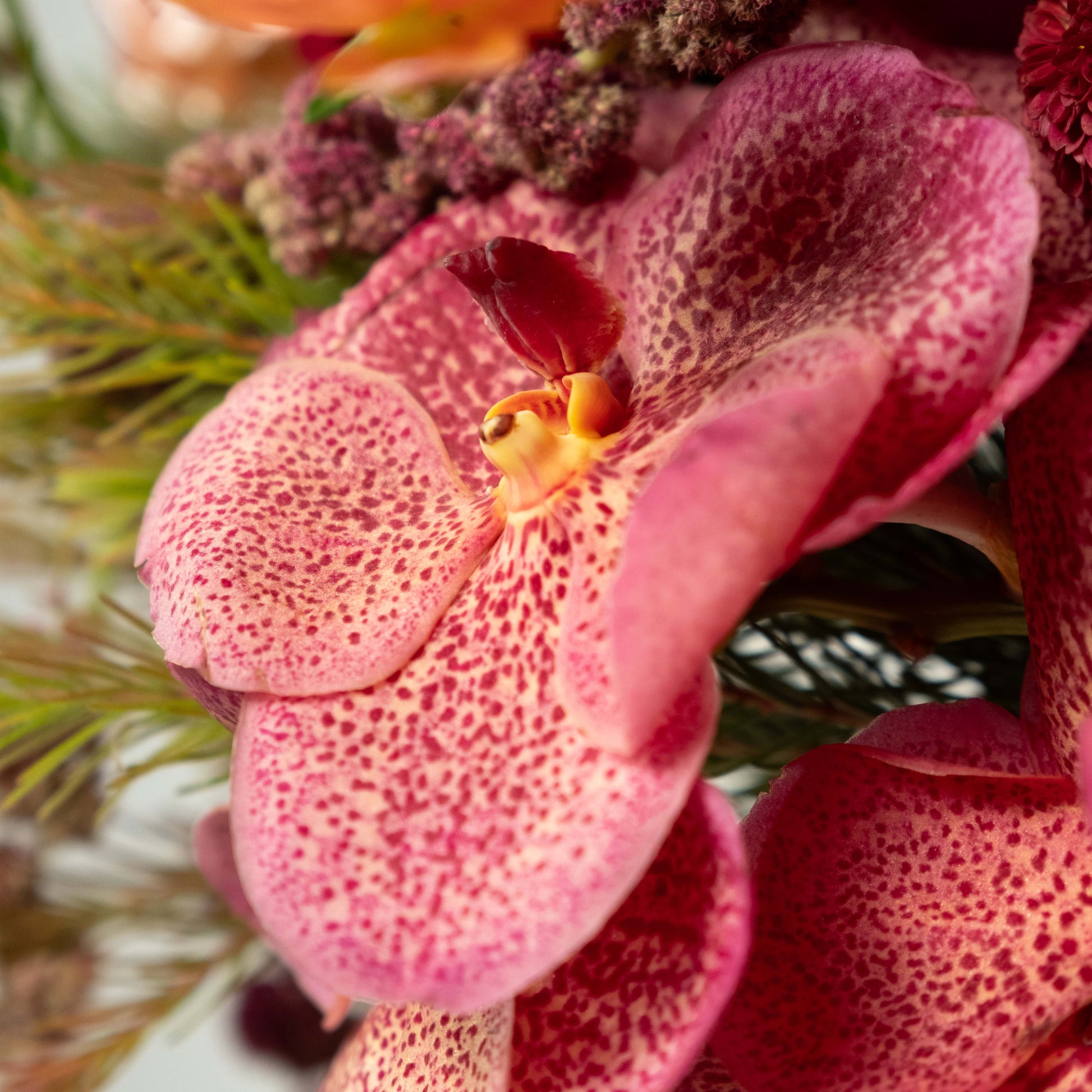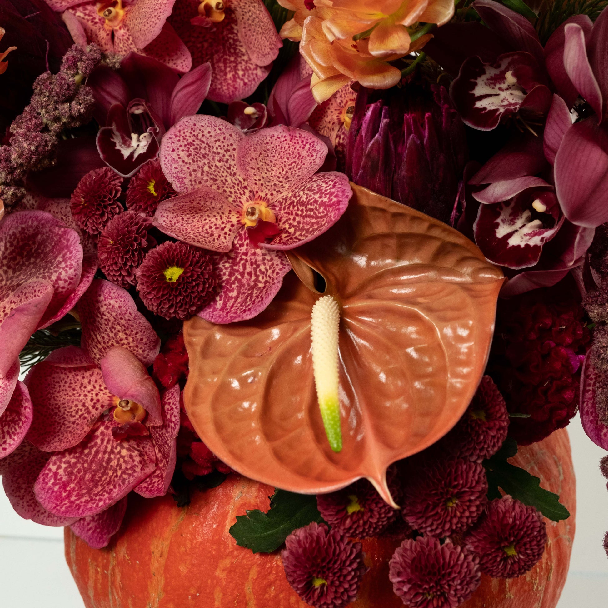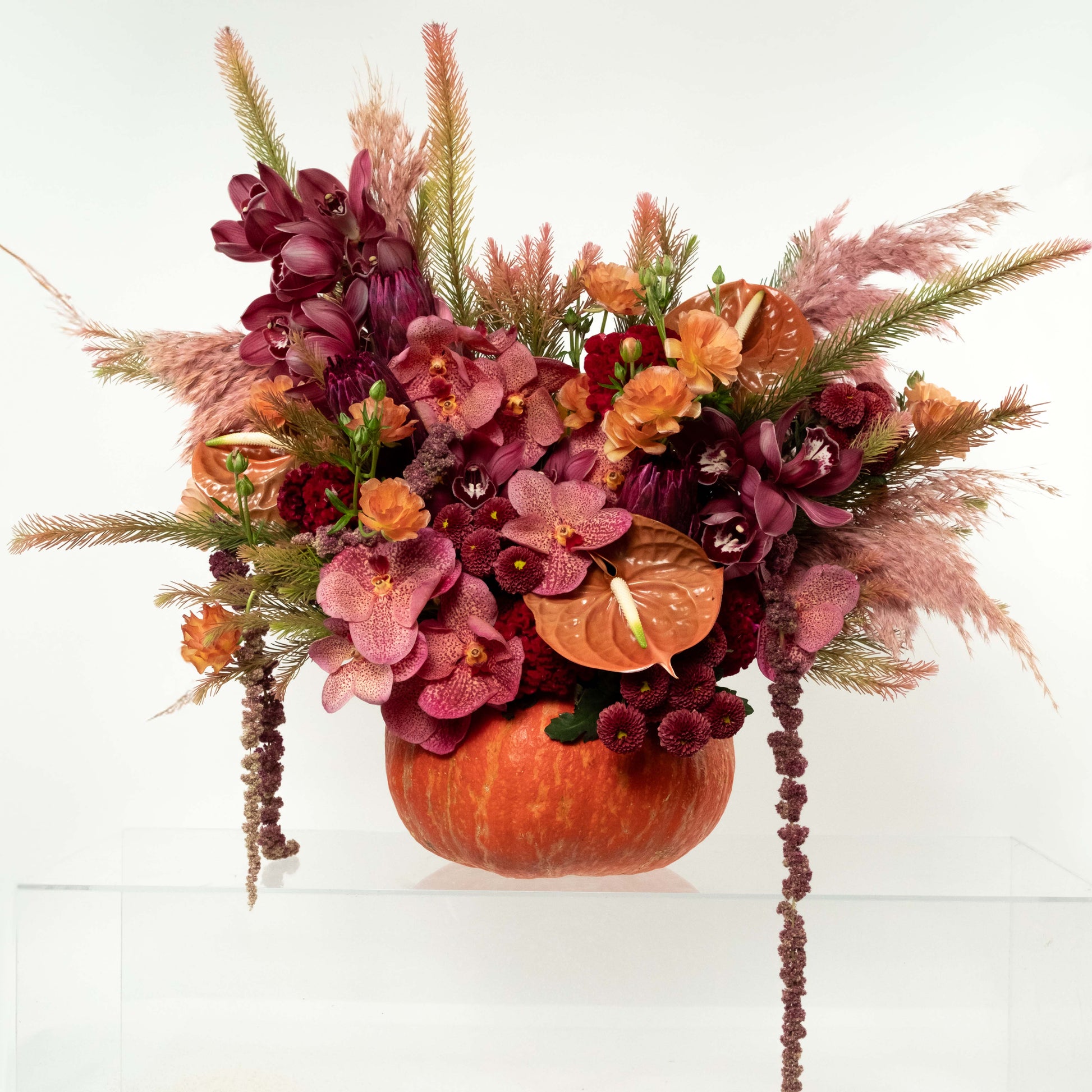 Soft yet striking, Rosé Solstice embodies the poetry of fall through a romantic, textural lens. Designed in a hand-carved pumpkin, this lush composition features an exquisite medley of Anthurium, Cymbidium Orchid, Vanda Orchid, Butterfly Ranunculus, Dahlias, Pampas Grass, and Fall foliage, a celebration of the season’s blooms.