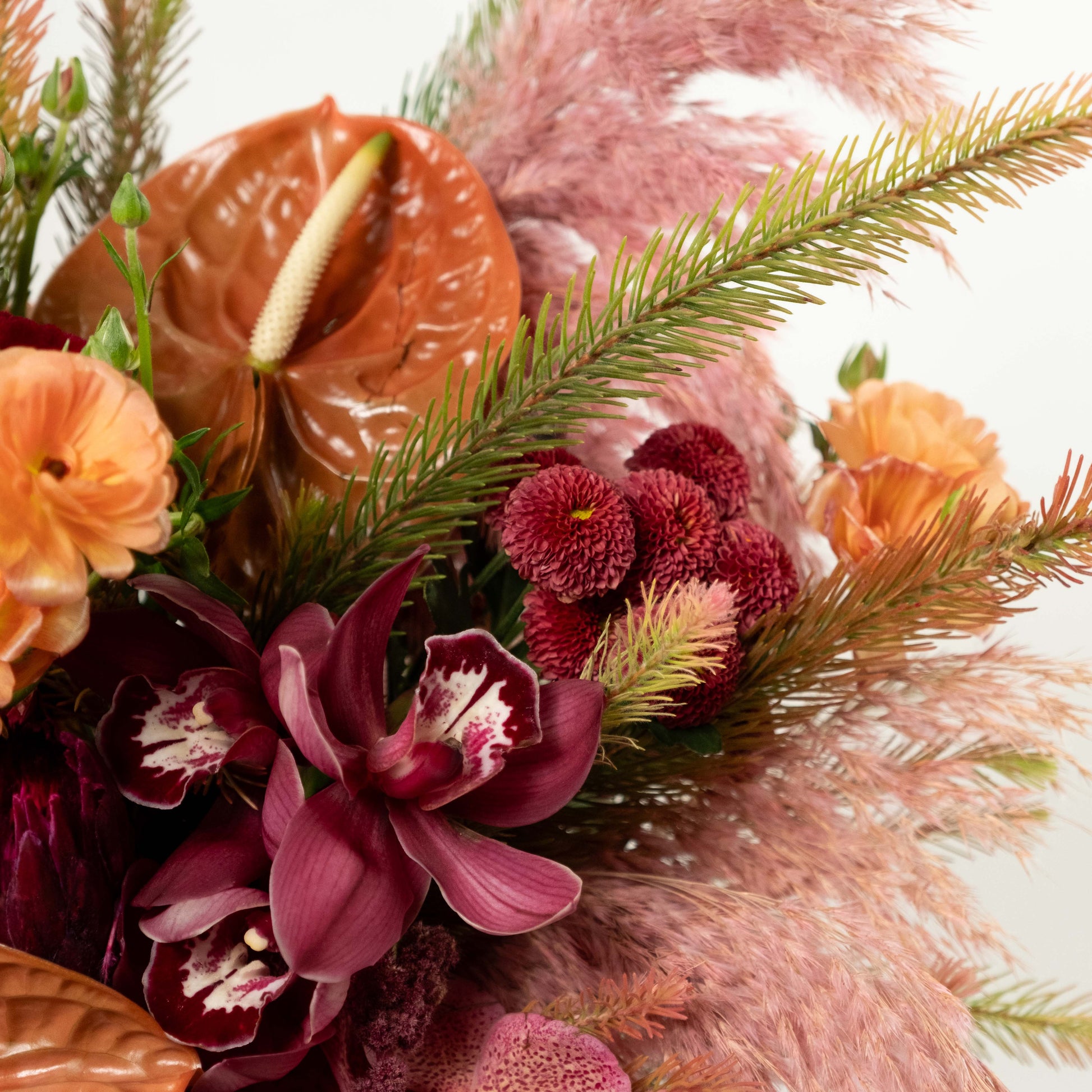 Warm tones of rose, rust, mauve, and terracotta dance in harmony, creating a palette that feels both ethereal and grounded. Airy plumes of pampas grass and cascading amaranthus add graceful movement, while orchids and dahlias bring an opulent finish, perfect for an elegant autumn tablescape or entryway centerpiece.