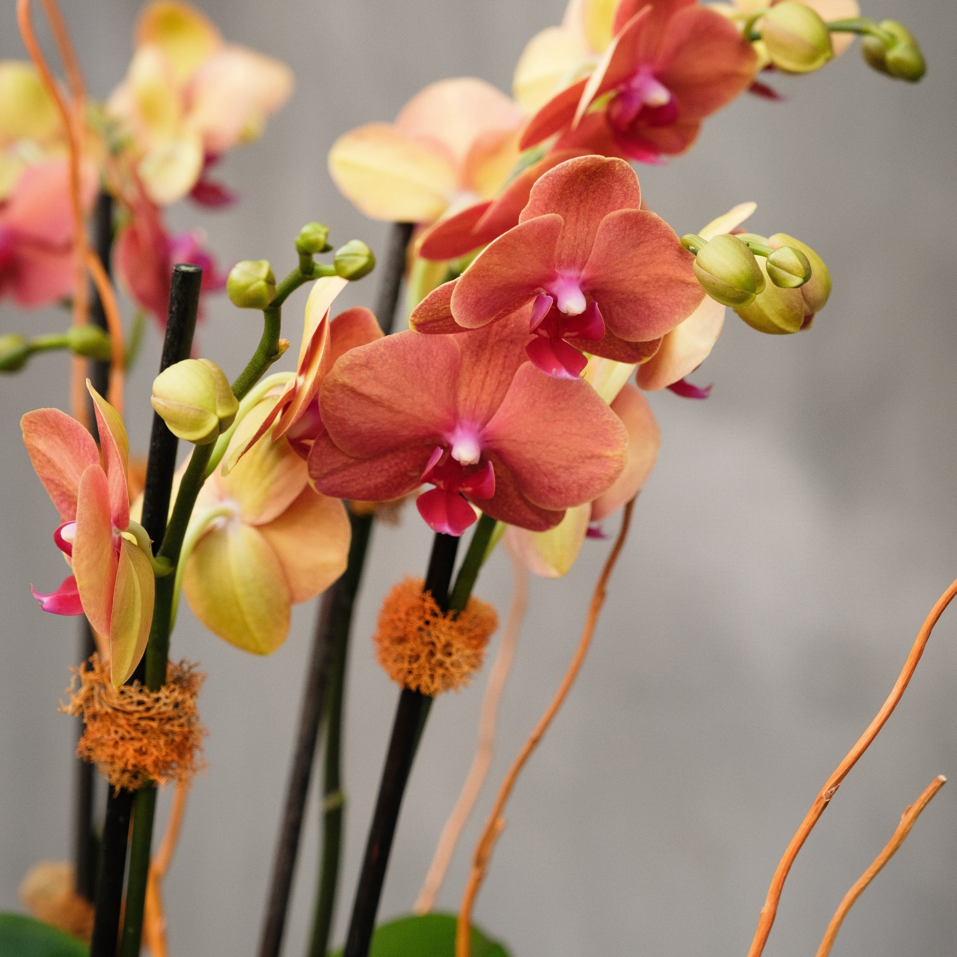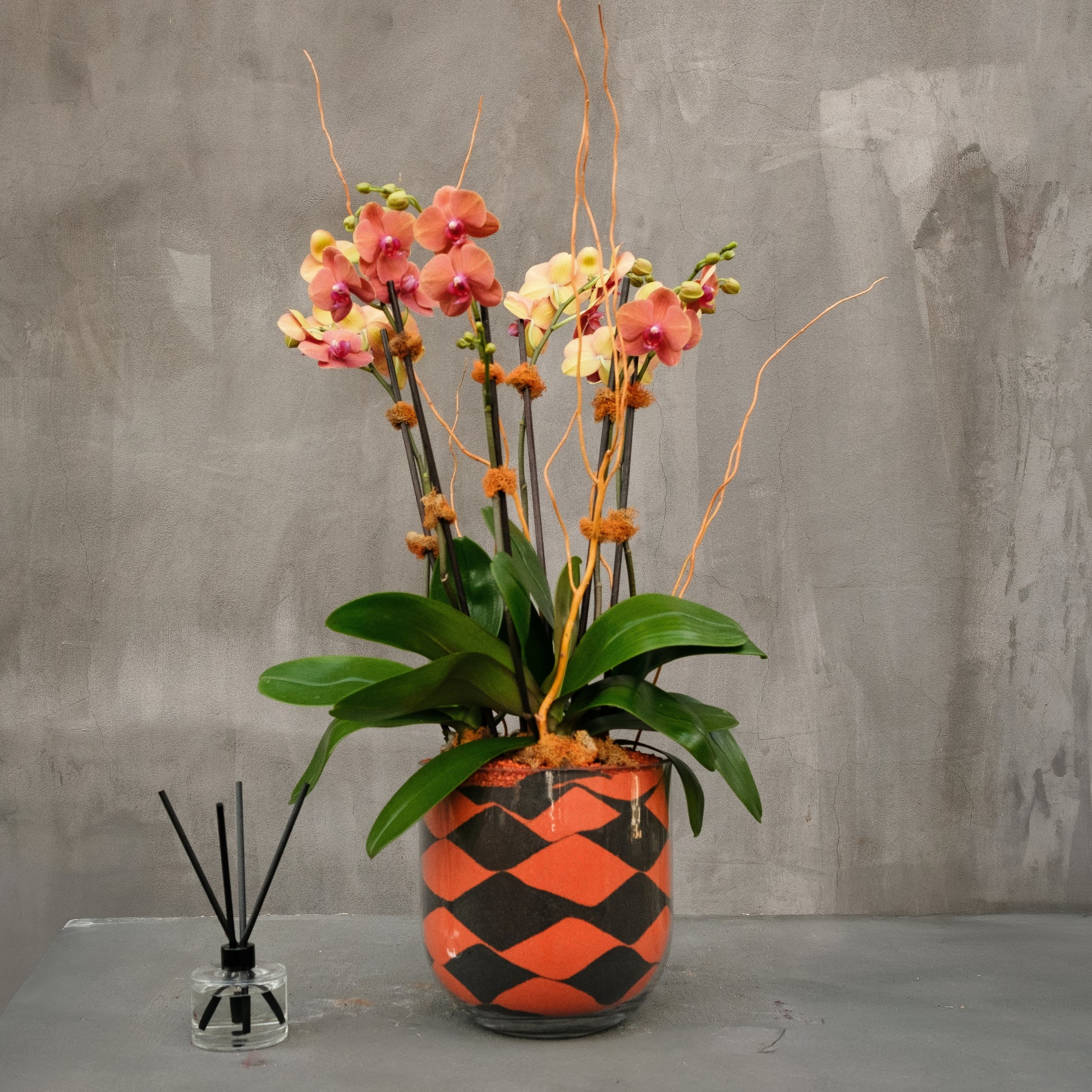 Graceful and contemporary, Autumn Muse Orchid brings a sophisticated seasonal touch to any space. Planted in a hand-painted orange and black harlequin vase, this double-stem Phalaenopsis Orchid showcases blooms in rich tones of apricot, coral, and soft gold, accented with sculptural curly willow branches and natural moss detailing for texture and warmth.