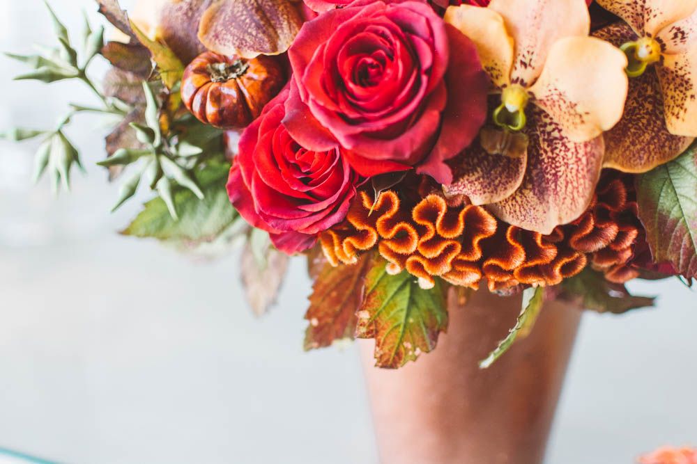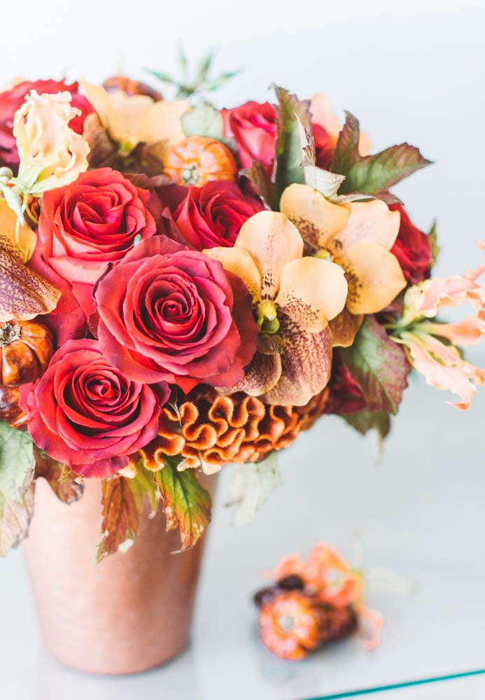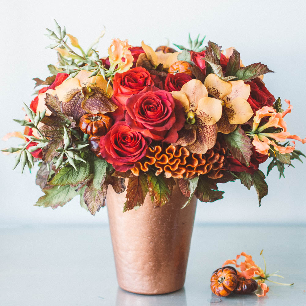 Autumn is calling and the leaves are falling! The rich brownish-red color of the Terracotta Matilda Roses perfectly compliment the vibrant orange gloriosa lilies, orange vanda blooms, and uniquely textured coxcomb. Maple leaves, dried pods, and miniature pumpkins add a perfect seasonal touch. A 6 inch by 7 1/2 inch tall rose gold vase acts as the base of this stunning 15 inch tall Autumn arrangement.