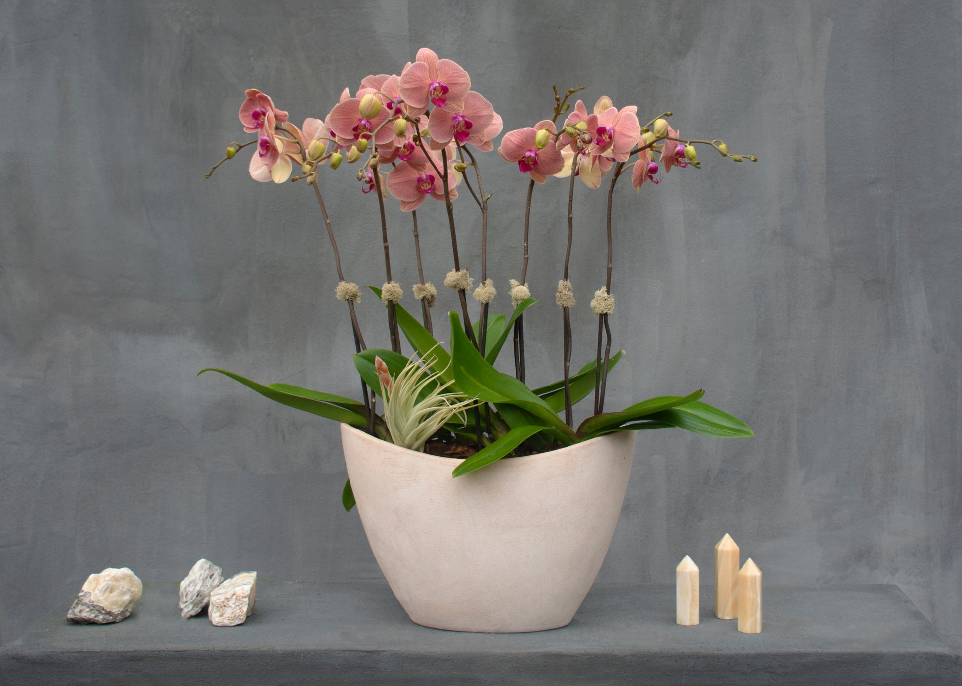 A delicate symphony of nature’s finest details, Blush Haven enchants with soft pink orchids kissed by rich magenta centers. Eight graceful stems rise above lush green foliage, exuding elegance and tranquility. Nestled in a subtly textured off-white vase with warm, earthen undertones, this arrangement is a timeless statement of beauty. Perfect for elevating any space with its refined charm.