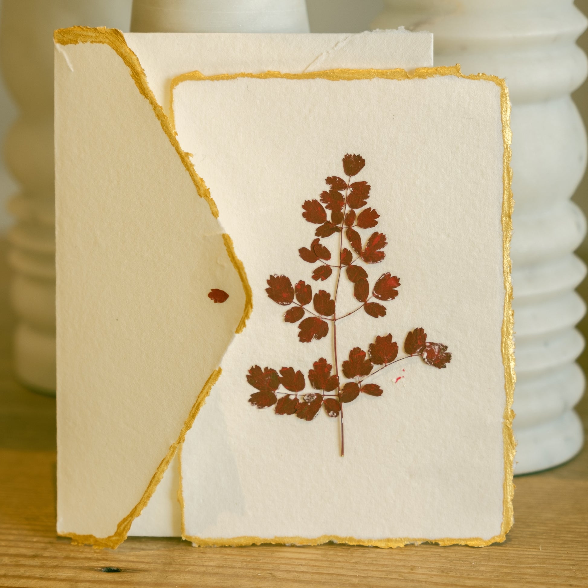 Share your emotions with the power of flowers. These hand-painted greeting cards with golden edges add a poetic touch to any gift with real pressed flowers. Each card is created in our Los Angeles store using hand-made cotton paper. Cards includes an envelope adorned by a matching flower and a golden sticker to seal it.