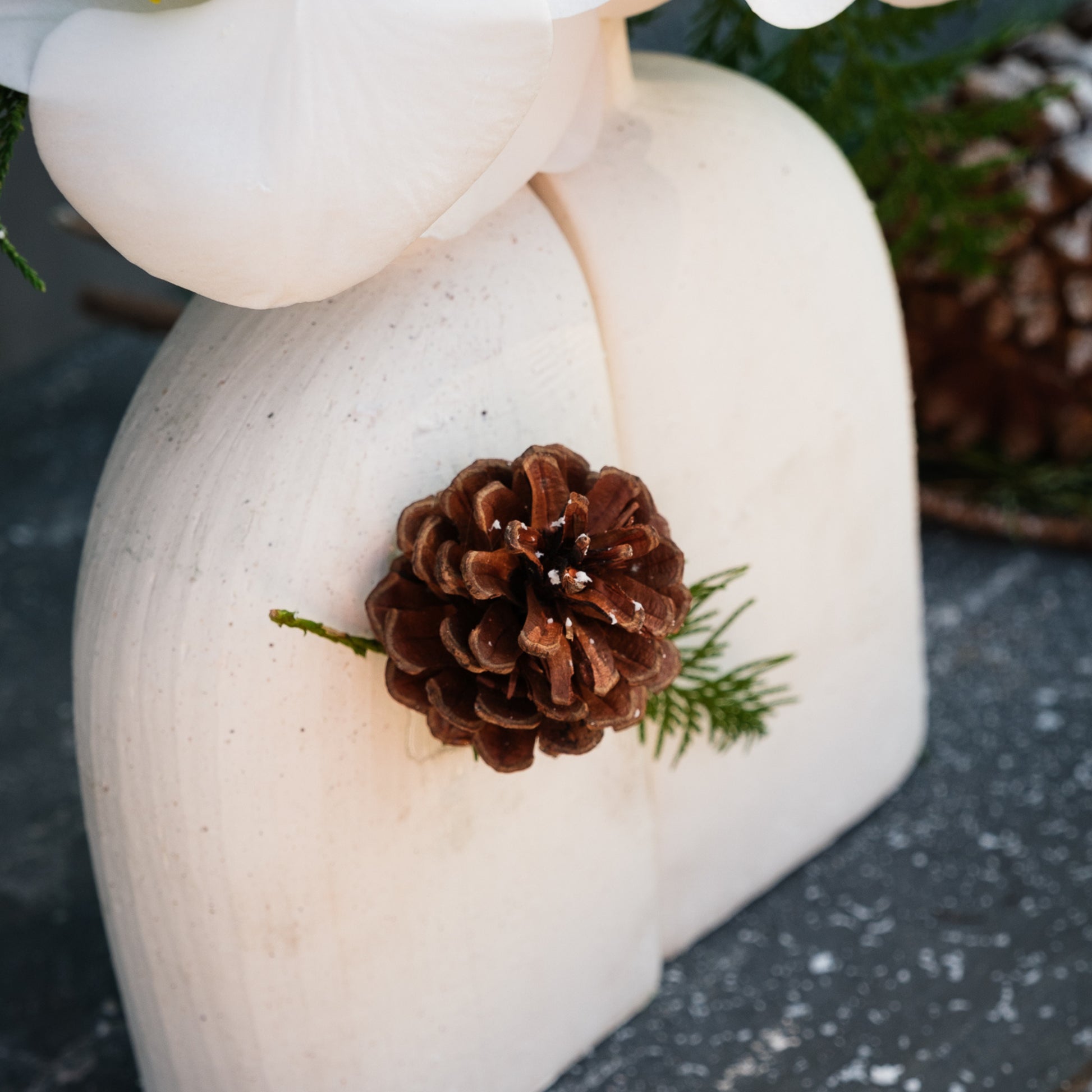 Please note: Each arrangement is handcrafted with live orchids, natural cedar greenery, and real seasonal elements. Branch formation, bloom shape, and pinecone placement may vary slightly, ensuring every piece is a one-of-a-kind expression of winter artistry.