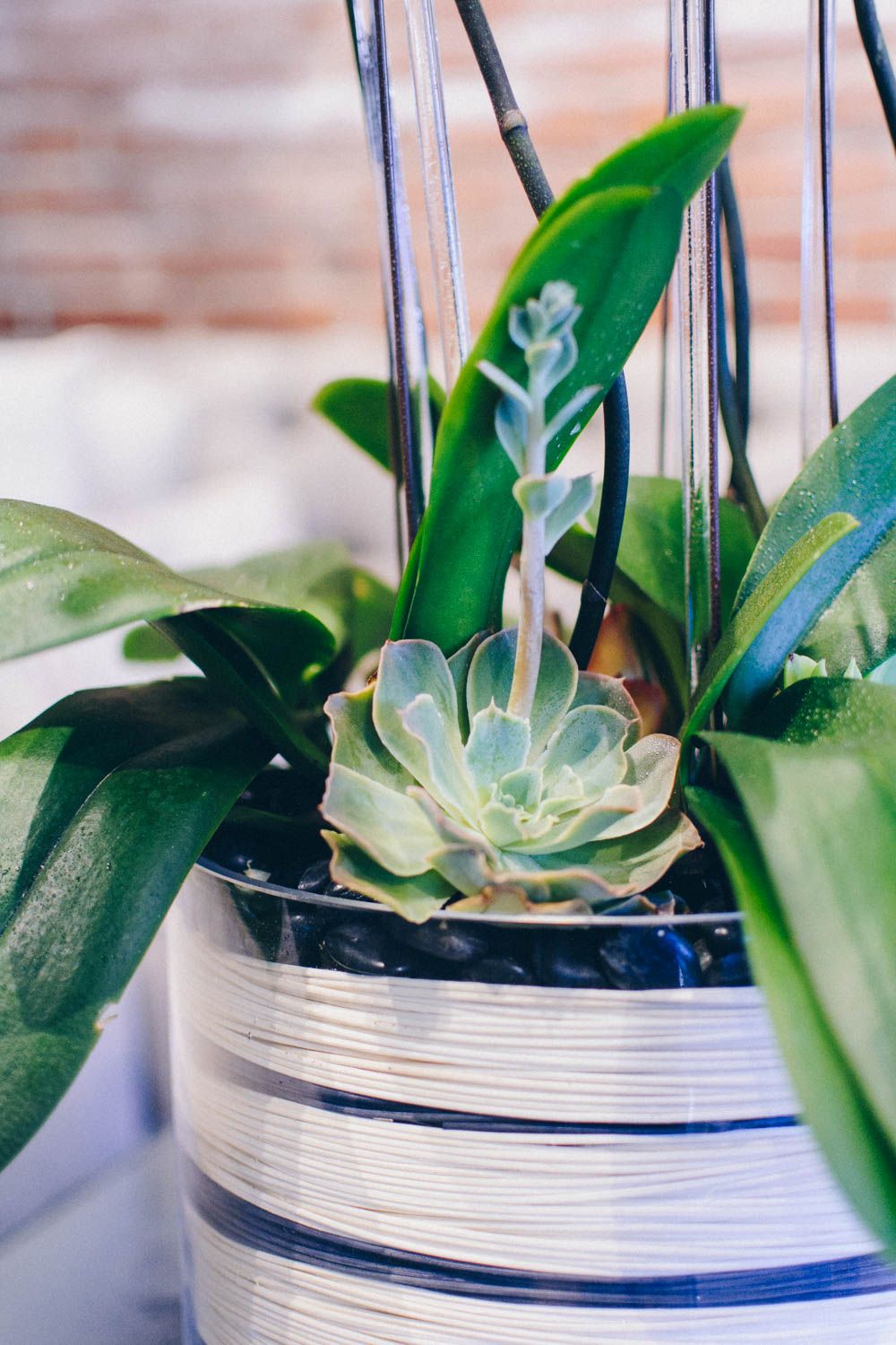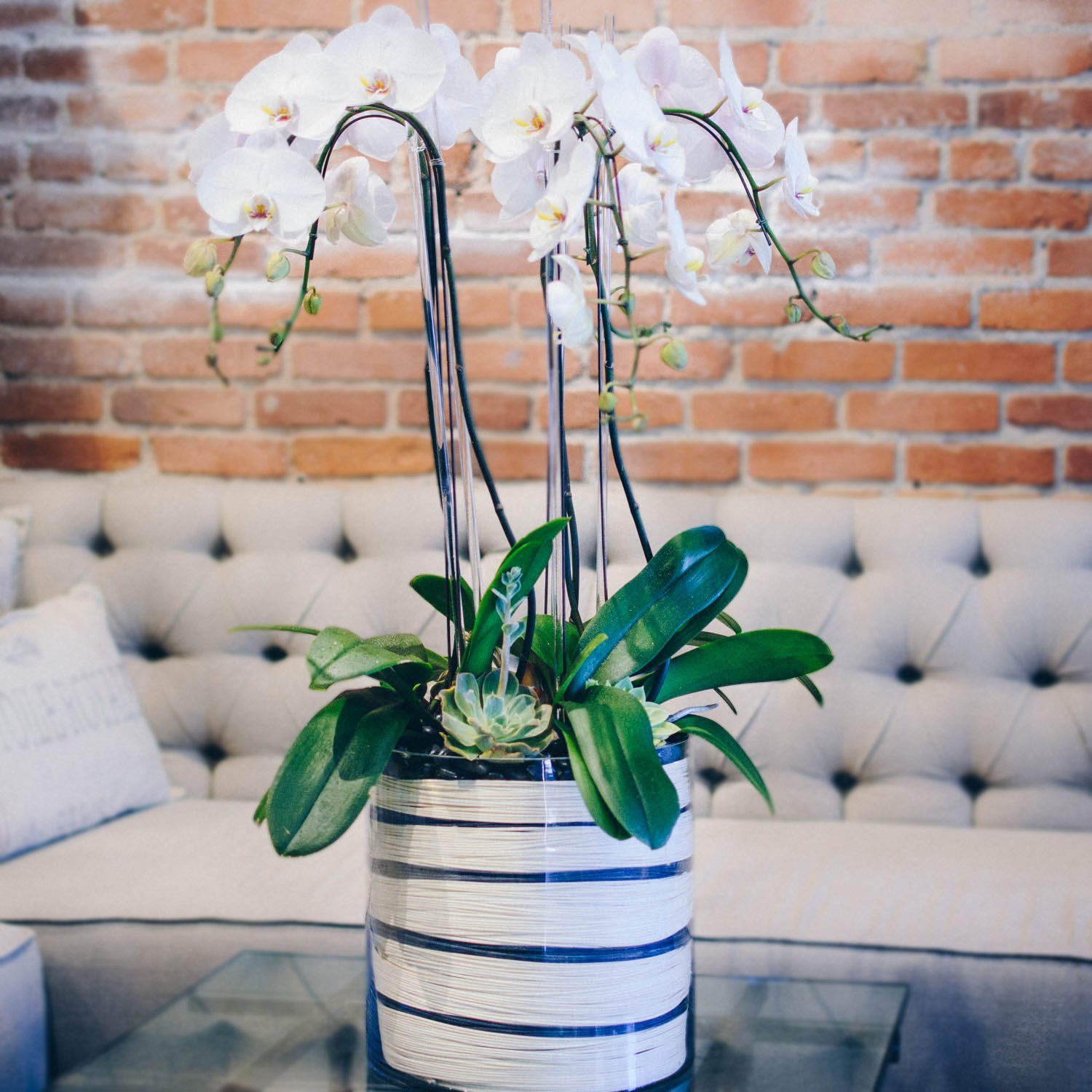 This timeless beauty of a design features five sky high stems of crisp white phalaenopsis plants. All resting atop a 12" tall glass cylinder vase lined with modern strips of white and black midolinno sticks and topped with smooth black river rocks and hand selected succulents, this grand design stands at approximately 37" tall overall. Please note that orchids will vary in height.