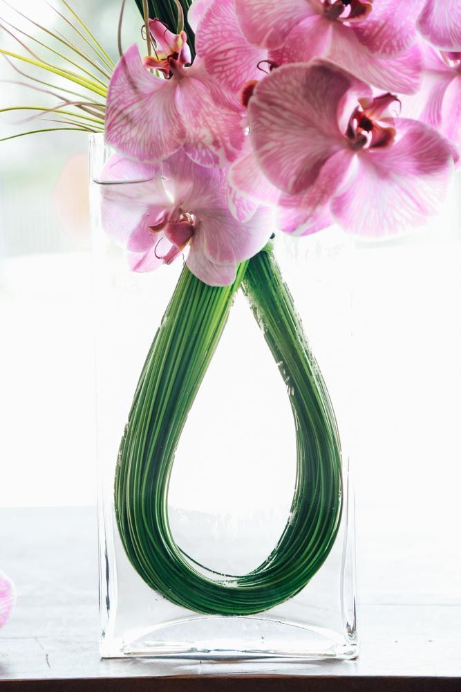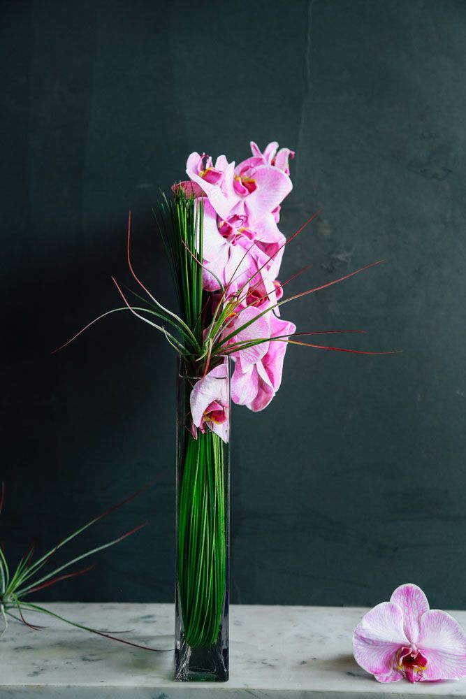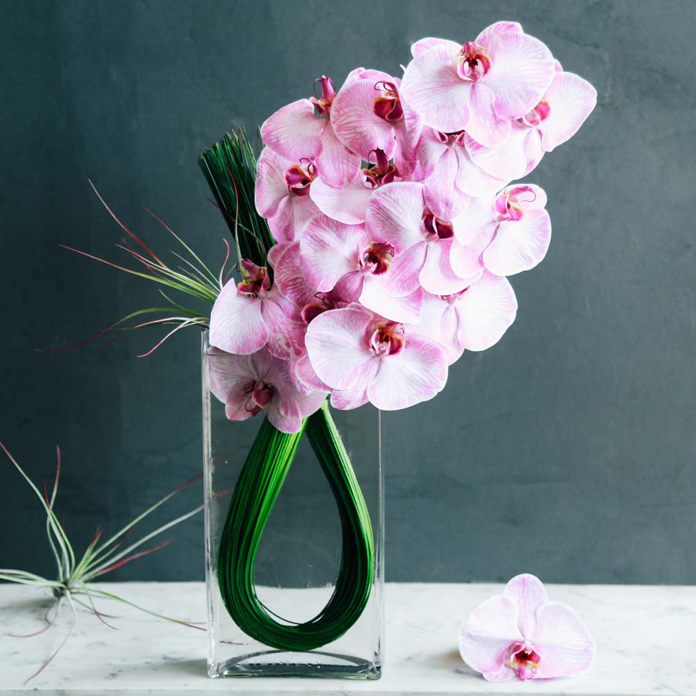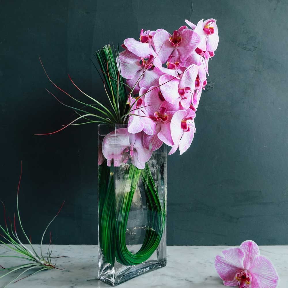 Take in the exquisite minimalism and beauty of this beautiful floral arrangement. Phalaenopsis Orchids in bright pink are stacked together, resting opposite of an air plant. Steel grass in brilliant green twines together, holding the orchid blooms and submerged within the 8” rectangular glass vase. Overall, this arrangement stands 14” tall.