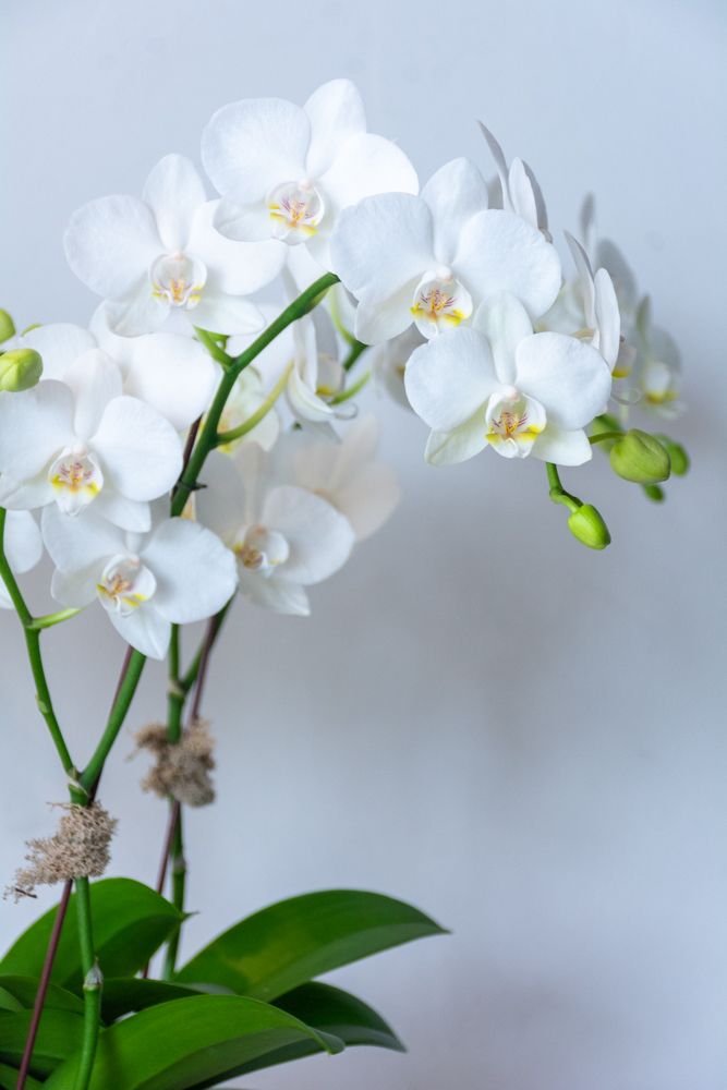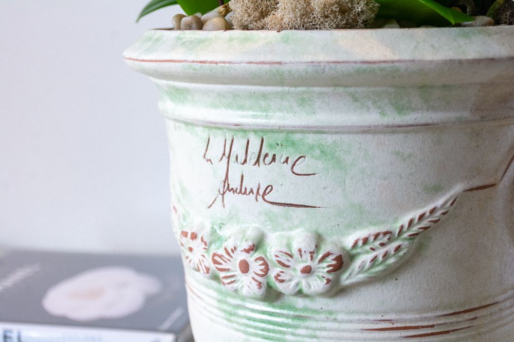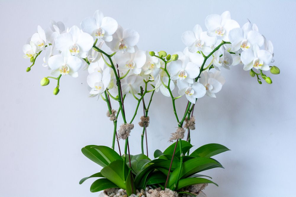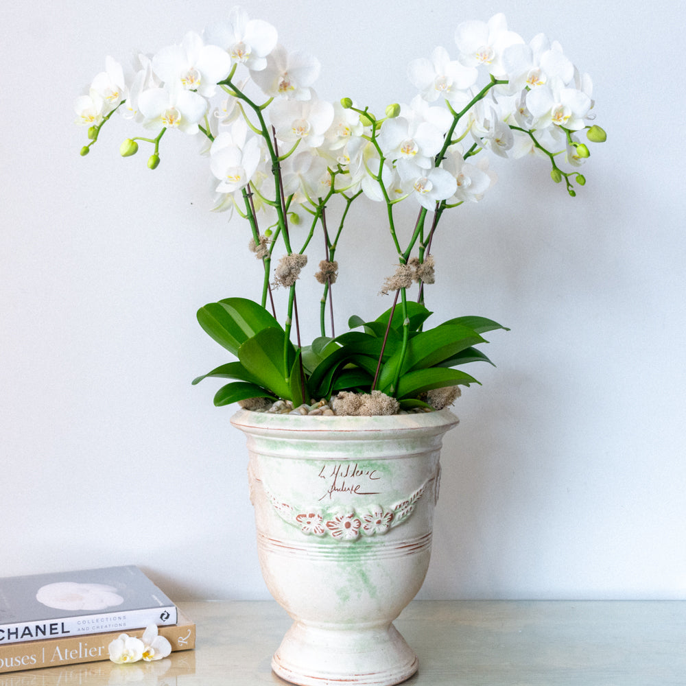 This luxurious new orchid design features an authentic French La Madeleine Anduze planter. Five stems of crisp white phalaenopsis orchids stand tall atop a bed of natural colored moss and natural river rocks. This 12" x 10" ceramic pot perfectly captures the antique urn style and traditional essence of Anduze pottery. Overall, this La Medeleine Anduze stands at approximately 28" tall overall. Please not that orchid stems may vary in height.