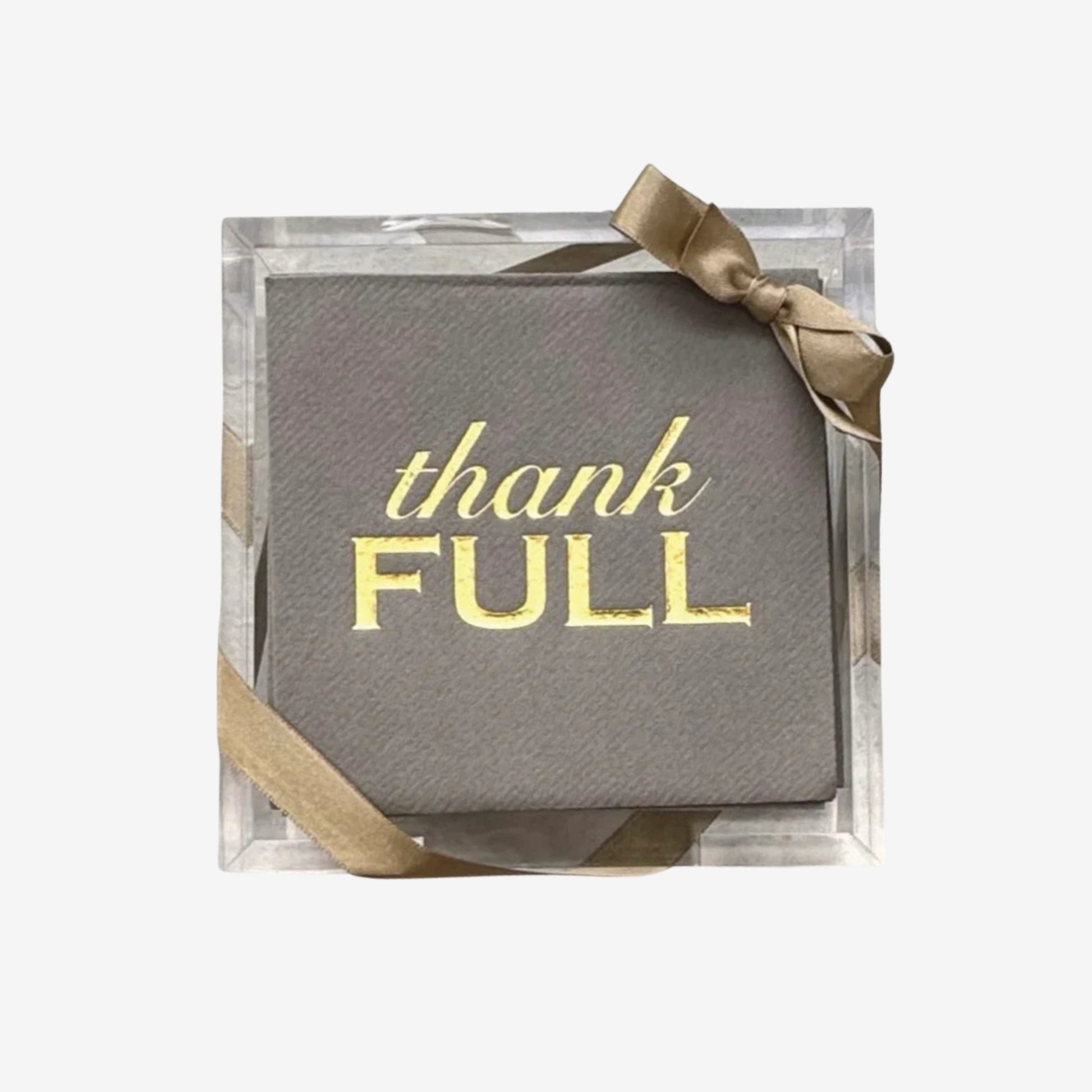 Our heavy-weight acrylic tray, filled to the brim with ash napkins printed with luxe gold foil napkins and tied with festive ribbon, makes for the perfect accent for your Thanksgiving gathering. A chic gift for the hostess with the mostest.