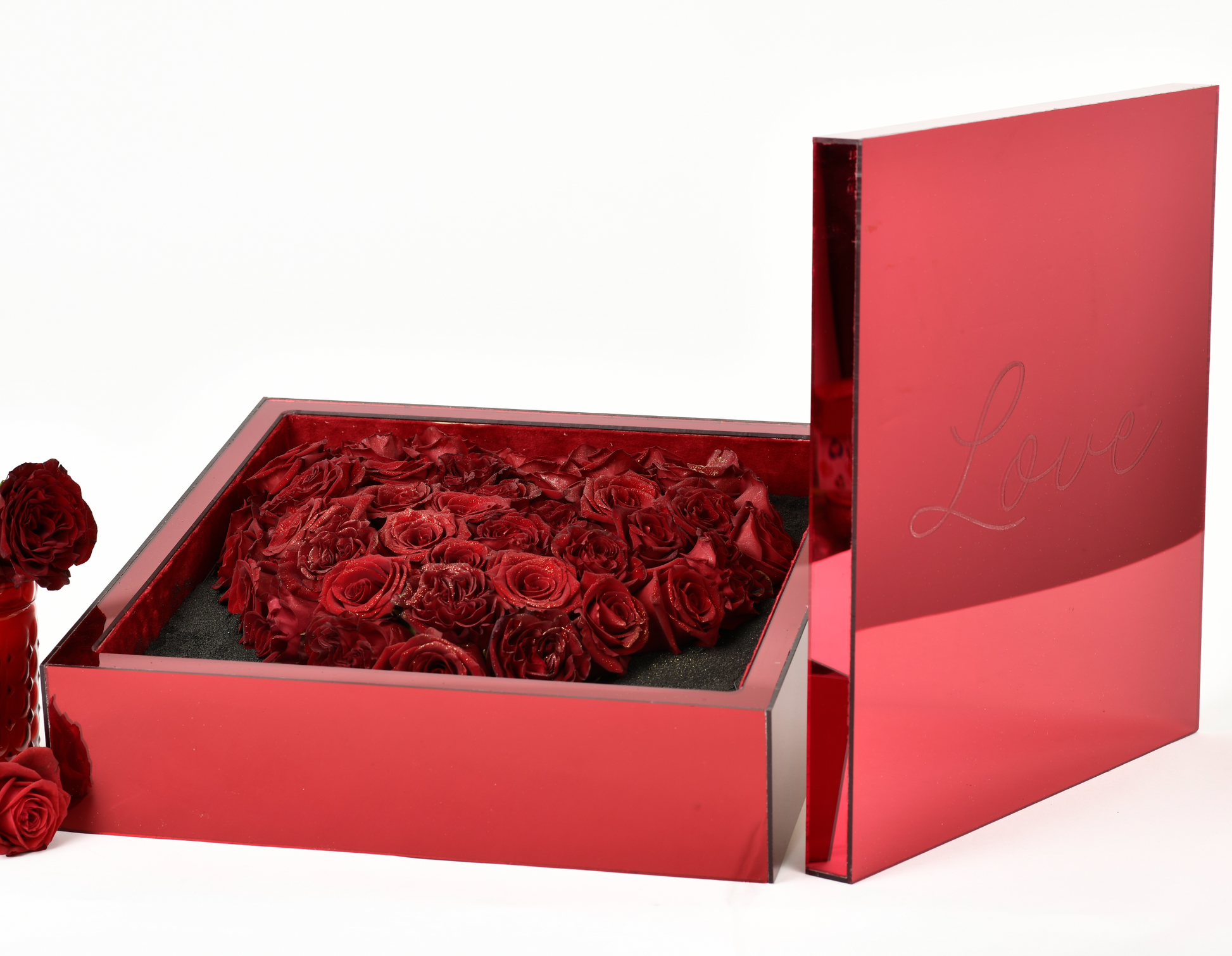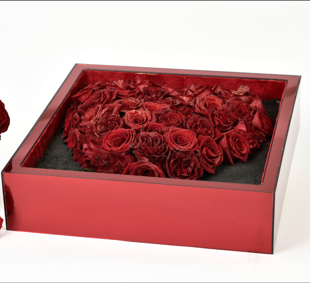 Presenting our exclusive limited edition Red Mirrored Box – a masterpiece crafted with precision. Immerse yourself in the allure of this stunning personalized mirror box, featuring a luxurious red plexi-glass finish. Within, discover an exquisite heart of deep red roses delicately cradled amid ebony sand, creating a captivating visual experience. Measuring a generous 16" x 16" with a height of 6", this reusable box is not only a striking presentation but also a versatile keepsake. Elevating the luxury, it comes accompanied by a sumptuous red felt lining, adding an extra layer of opulence to this unique and unforgettable creation.