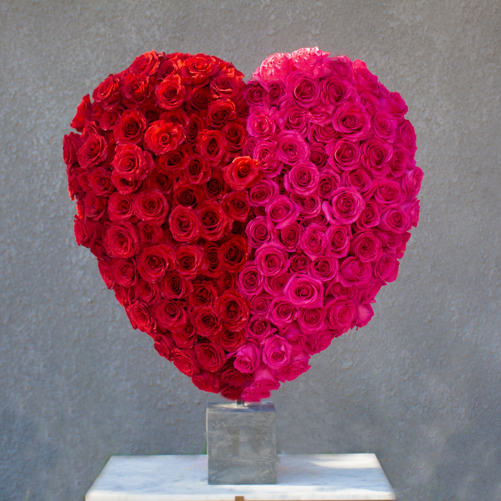 A striking symbol of love and passion, Love on the Line is where fiery romance meets playful affection. This bold floral heart is a masterpiece of contrast and connection, with vibrant red roses on one side and hot pink roses on the other, uniting in a perfect blend at the center. Standing tall at 28 inches atop a sleek cement block, this modern Valentine’s Day arrangement is a testament to the beauty of balance in love.