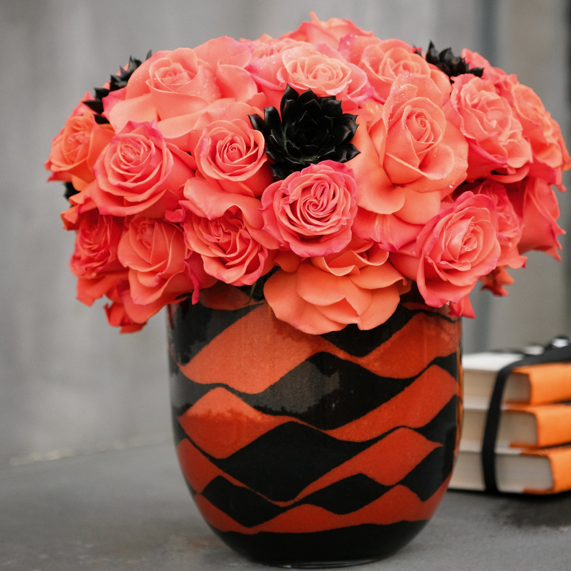 Enigmatic and enchanting, Witch’s Bloom conjures the perfect balance of mystery and allure. A vivid gathering of tangerine and burnt-orange roses, and black painted succulents, creating a bold, otherworldly statement. Designed in a hand-painted harlequin-patterned vessel, this arrangement casts a spell of sophistication, ideal for Halloween soirées, moody dinner tables, or as a striking centerpiece for the season.