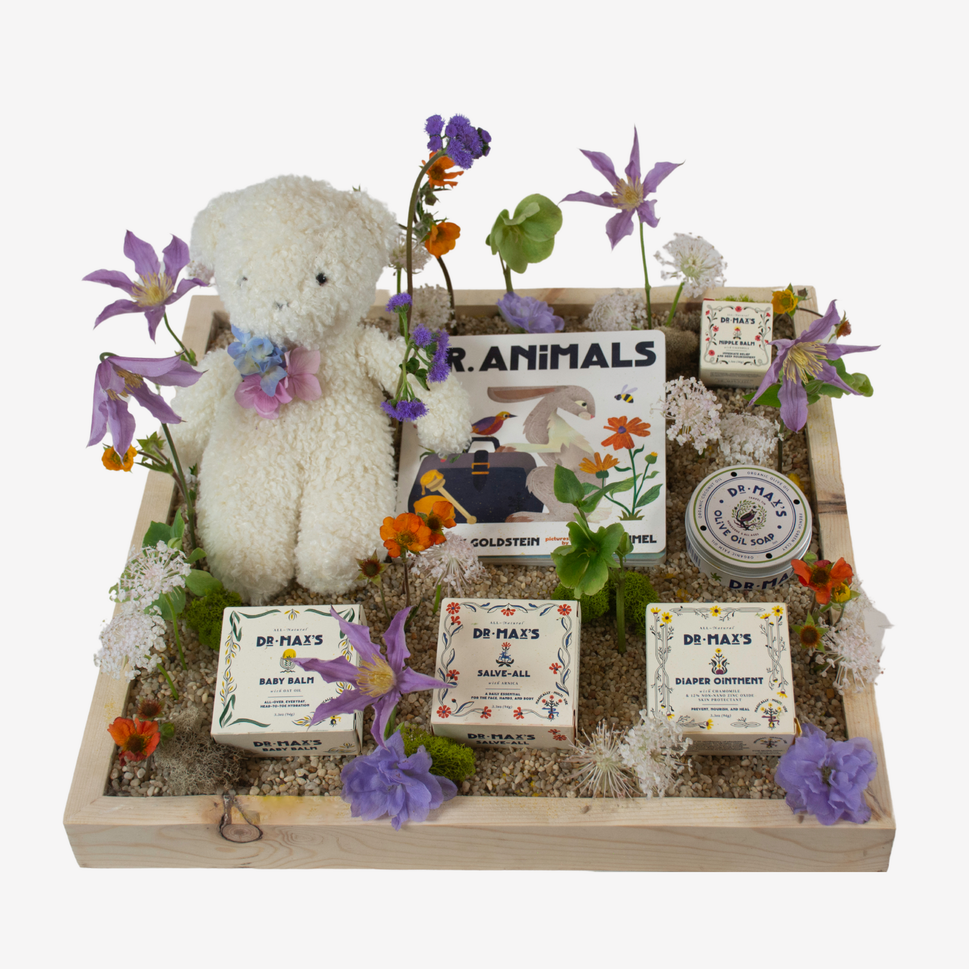 Celebrate new parents and their little ones with our exclusive flower box featuring Dr. Max and the Alimrose Charlie Bear. This one-of-a-kind 'New Baby' Gift Box features essential skincare products for parents and babies alike, as well as Dr. Max's children's book, 'Dr. Animals,' and a plush, cuddly, Alimrose bear.