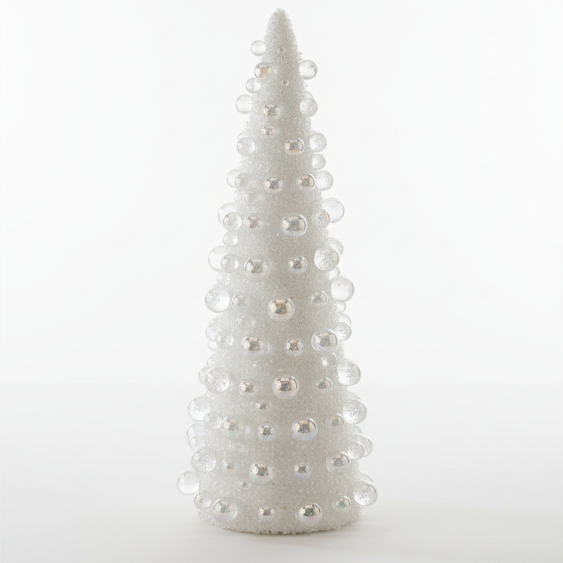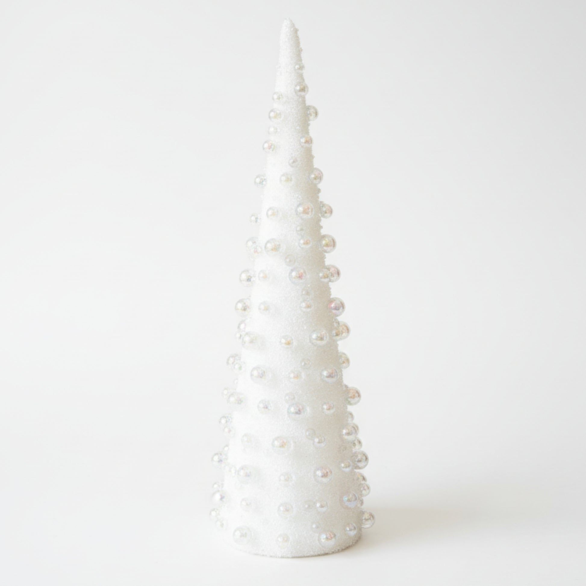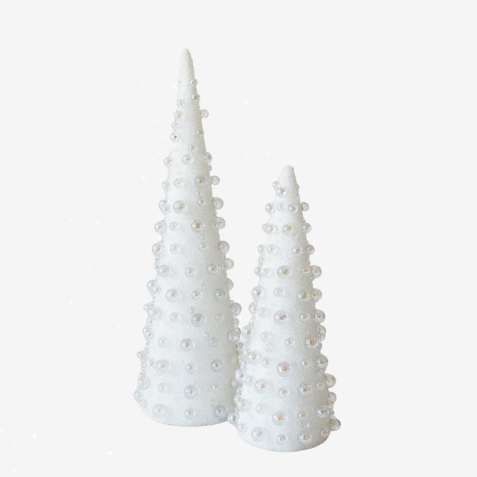Its tapered silhouette feels clean and contemporary, making it a natural fit for minimalist holiday vignettes, winter tablescapes, or styled shelves. The raised pearl detailing adds dimension and quiet glamour, evoking freshly fallen snow with a refined, editorial finish.