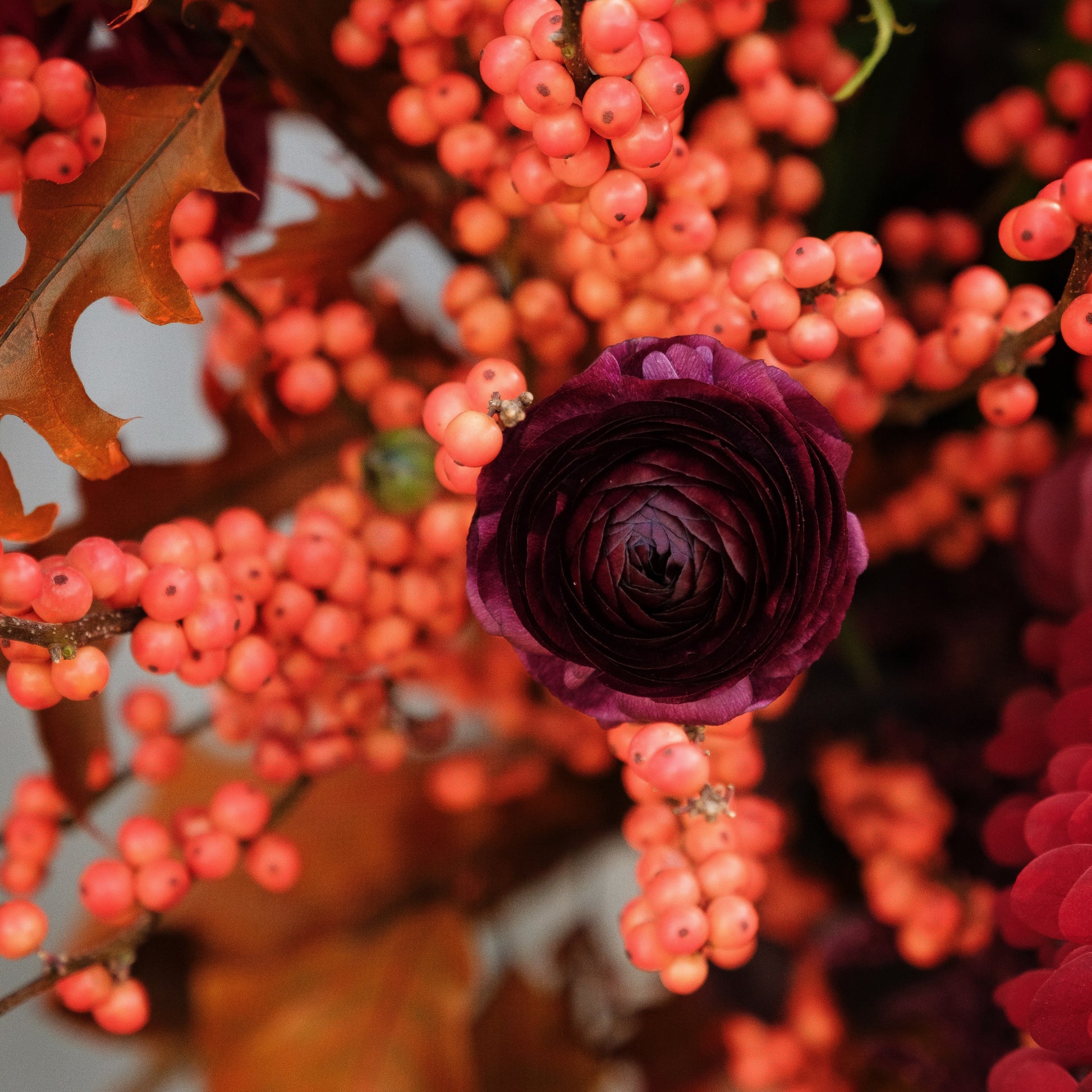 A palette of rose, peach, coral, and amber brings depth and radiance, while the natural movement of oak leaves and berry branches creates a sense of effortless grace. Perfect as a centerpiece or statement display, Rosy Harvest embodies the charm of fall gatherings and golden-hour elegance.
