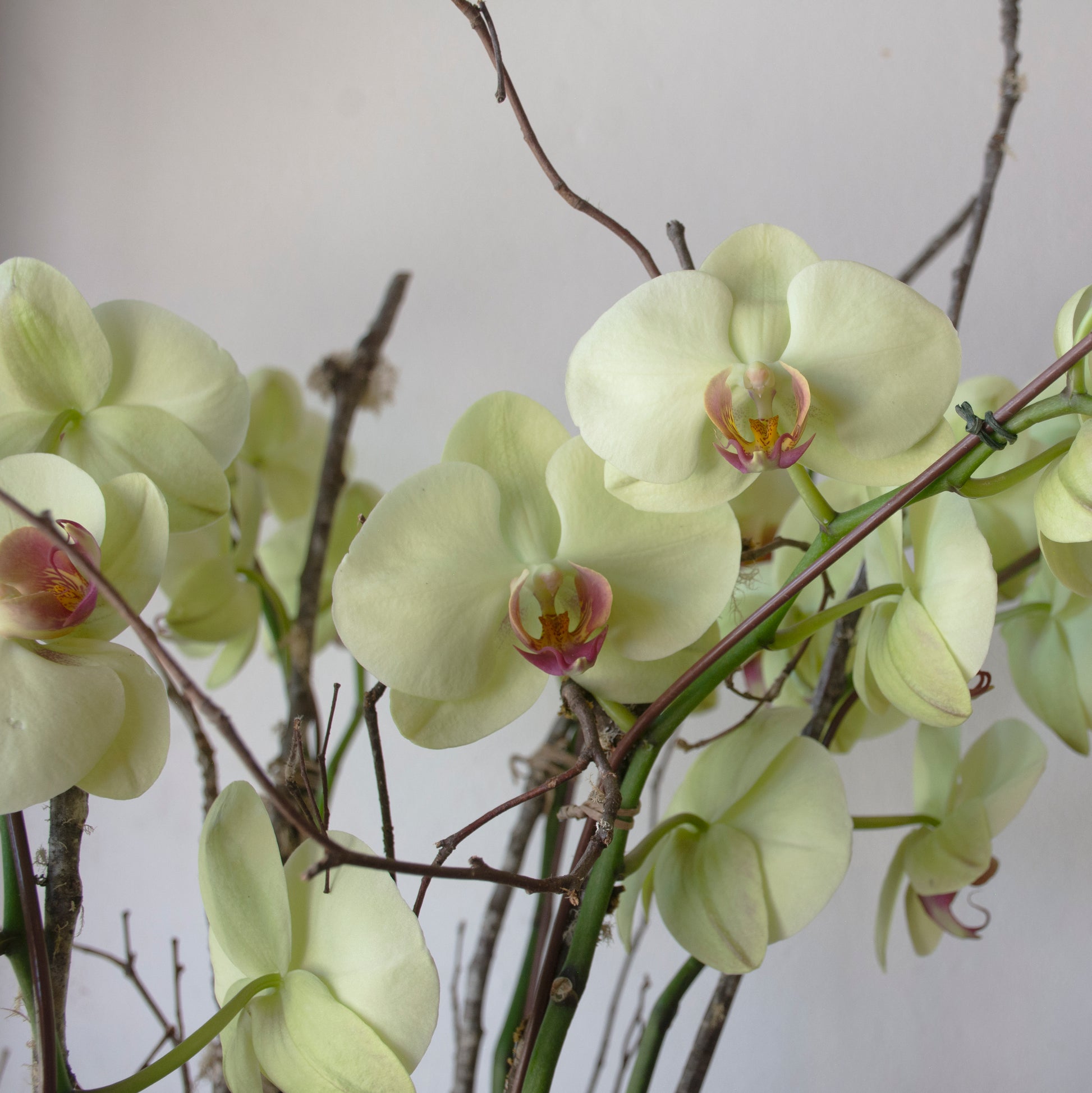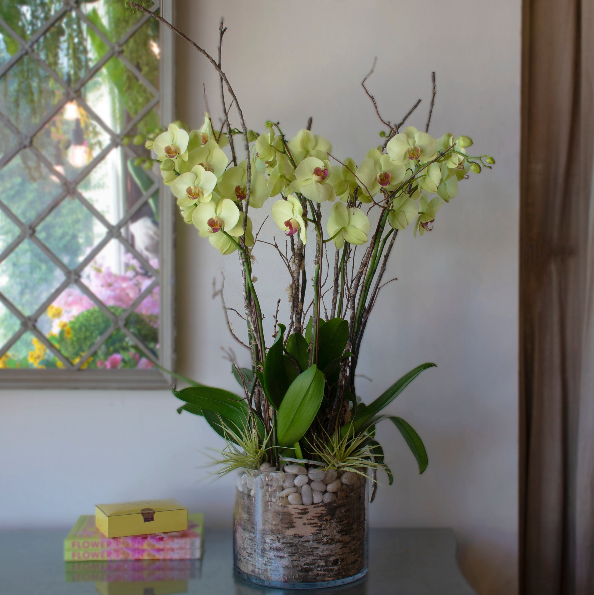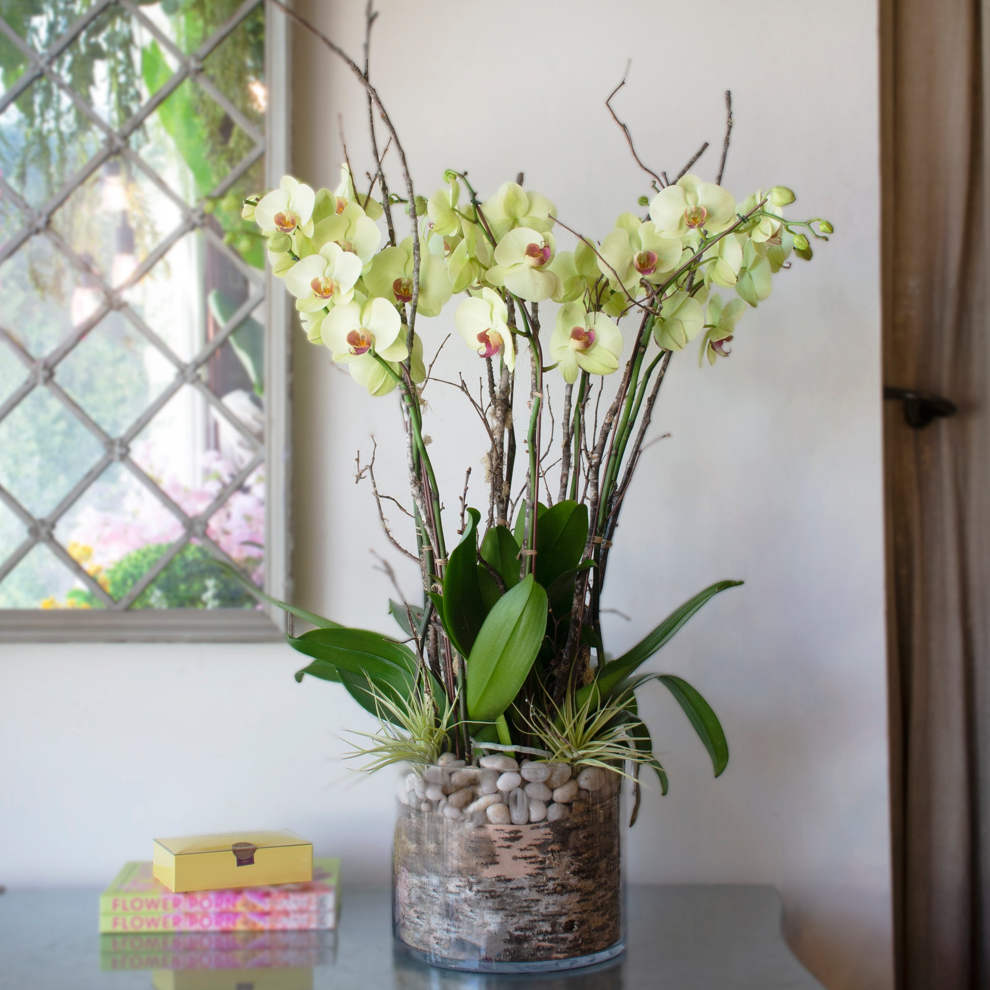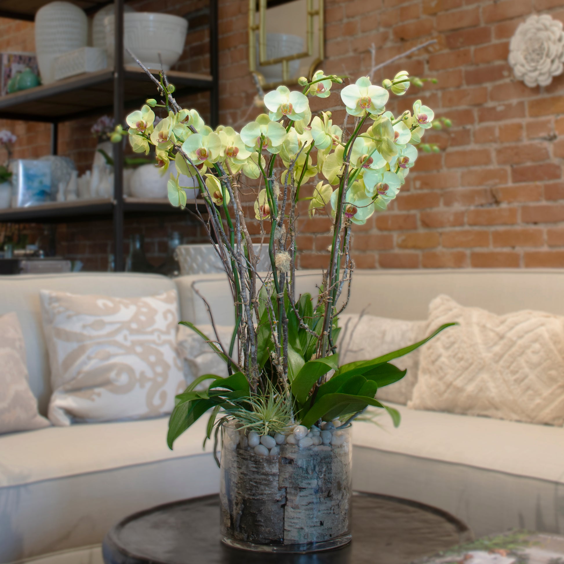 This elegant composition features four pale green double stemmed Phalaenopsis orchids accented with eight stems of Pussy willow and three Tillandsia air plants. Set in a nine inch wide glass vase lined with birch wood and earth toned river rocks, this clean green arrangement makes any space more serene. The Serenity Orchids stand at approximately twenty inches tall overall.