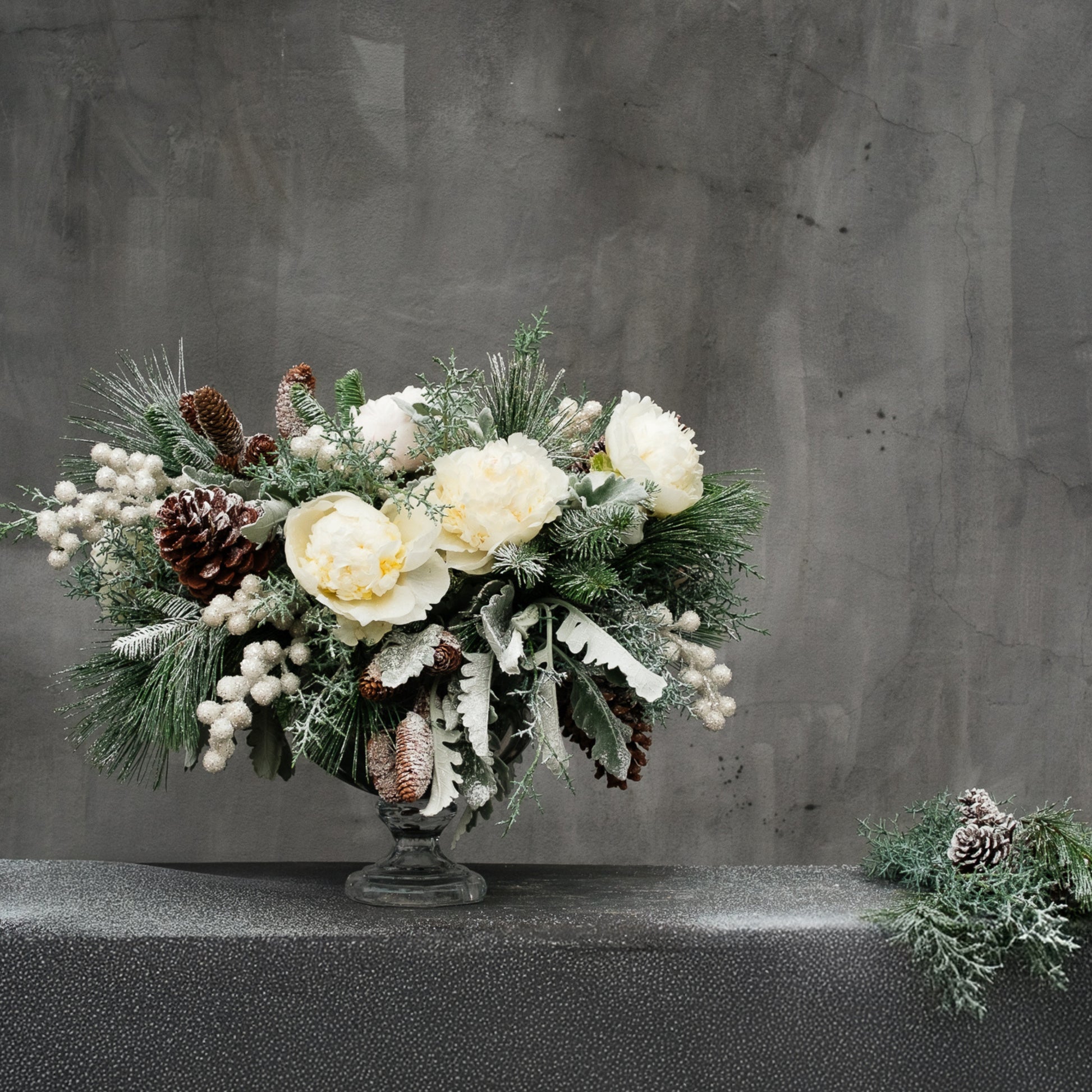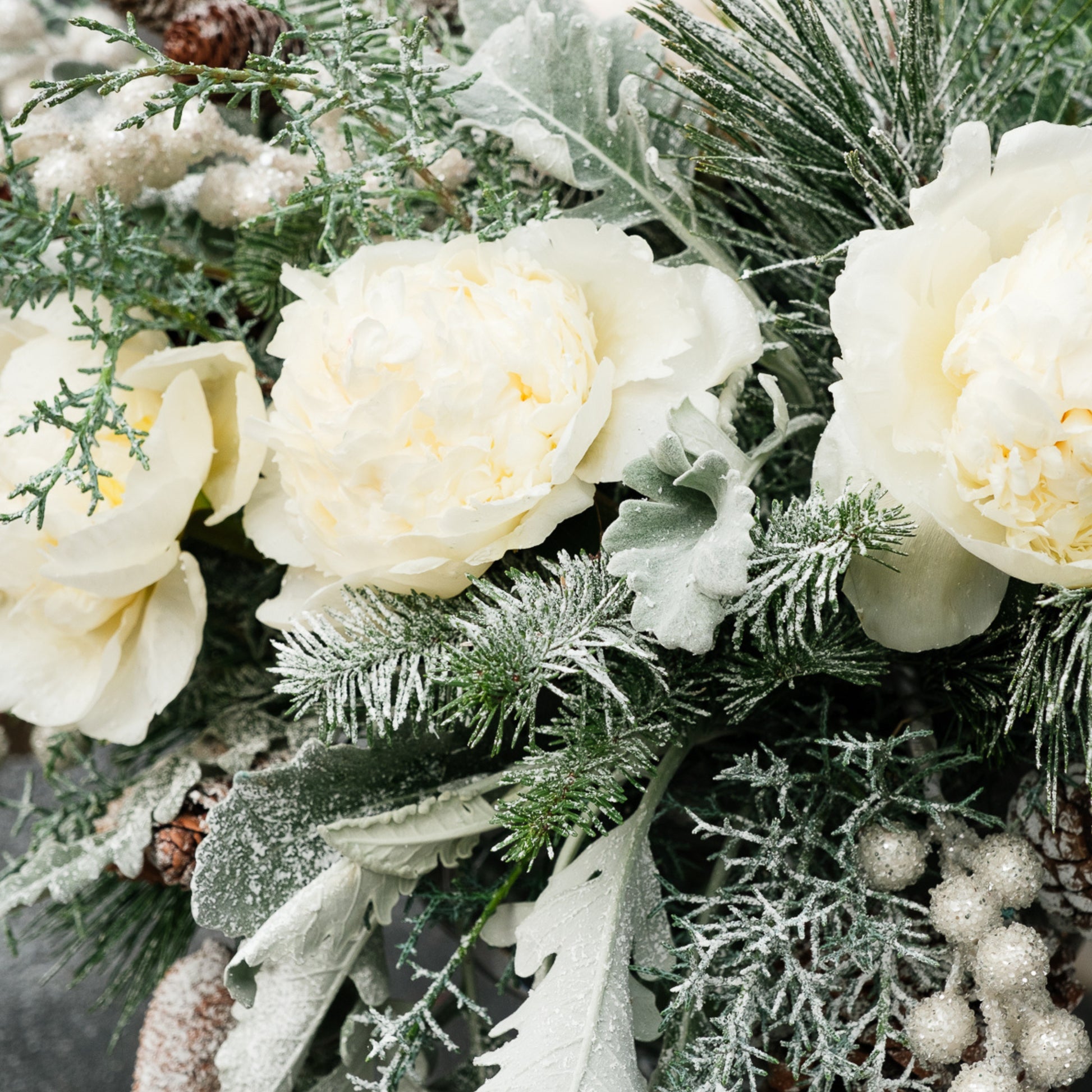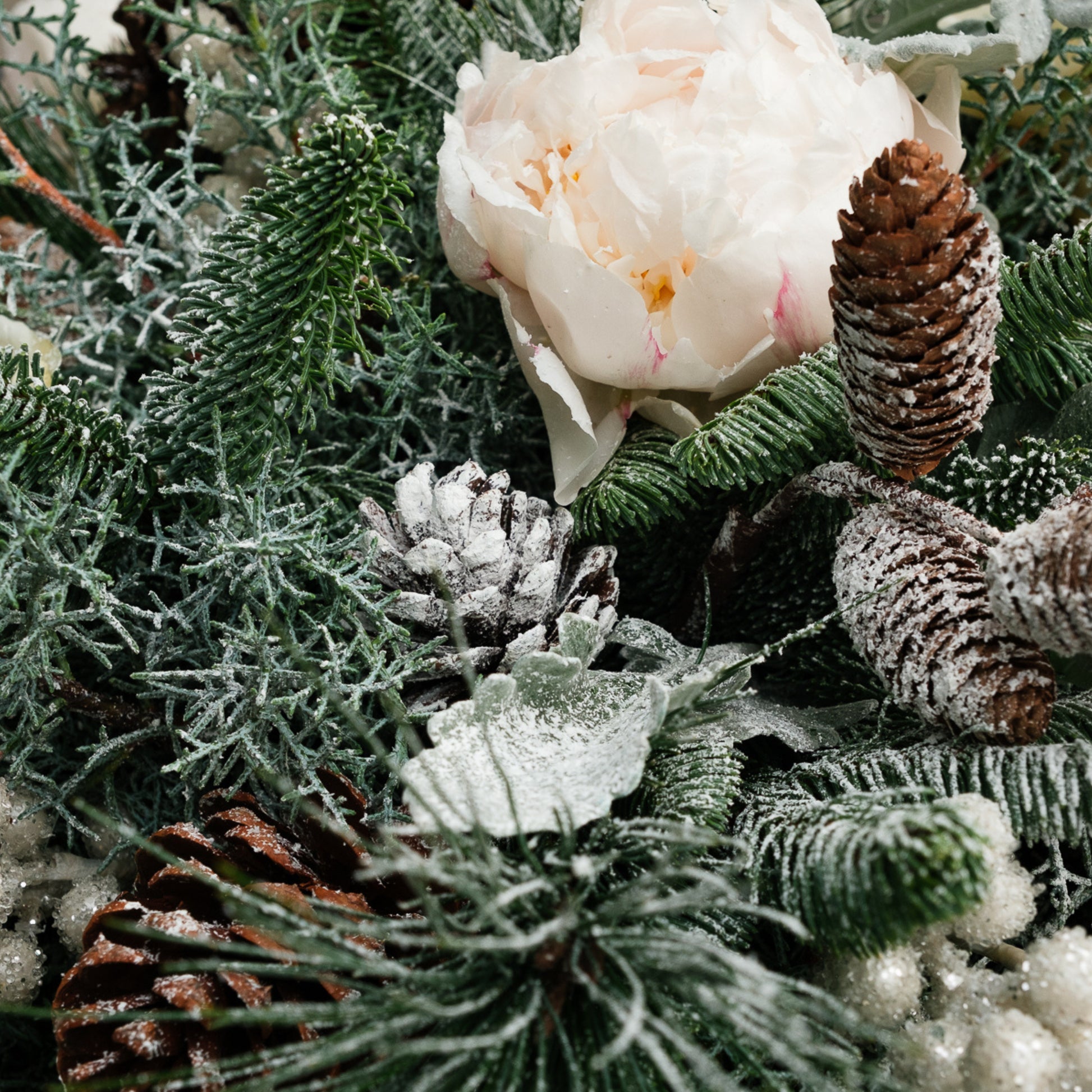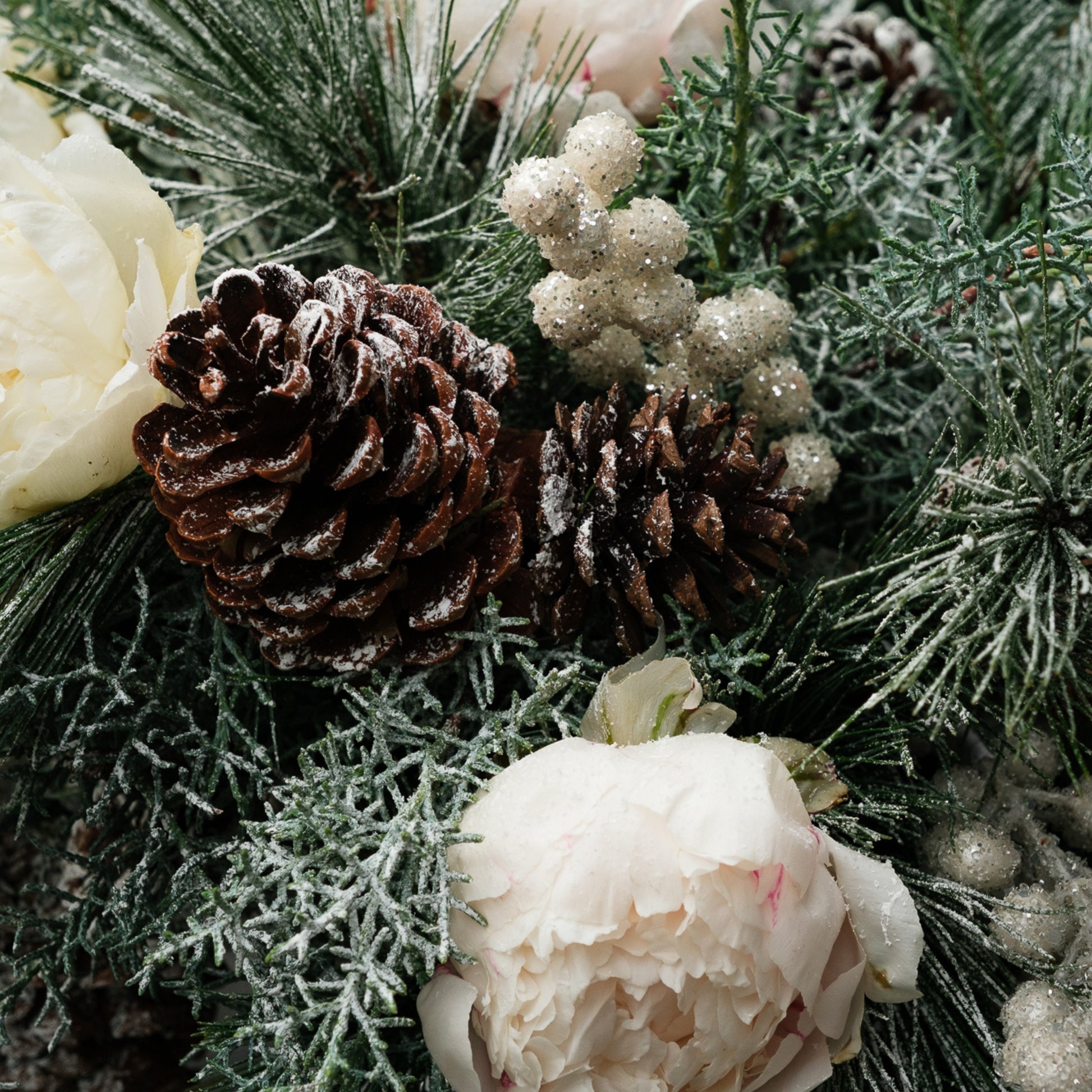 At its core, the arrangement features 4–6 premium ivory peonies, their ruffled petals opening like soft winter clouds against a backdrop of frosted cedar, pine, and juniper greens. Interwoven throughout, iced pinecones in varying sizes add natural structure and warmth, while sugared white berries introduce shimmering, crystalline detail. Textural accents of dusty miller and snow-coated foliage enhance the cool tonal palette, giving the entire piece a freshly-frosted, alpine feel.