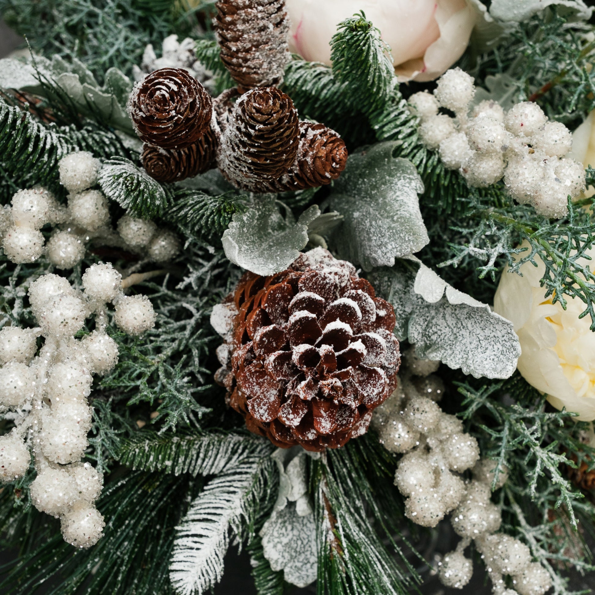 Please note: Each piece is handcrafted with fresh winter greens, natural pinecones, and premium blooms. Variations in frost texture, berry tone, and foliage formation are part of the design’s unique artistry and charm.