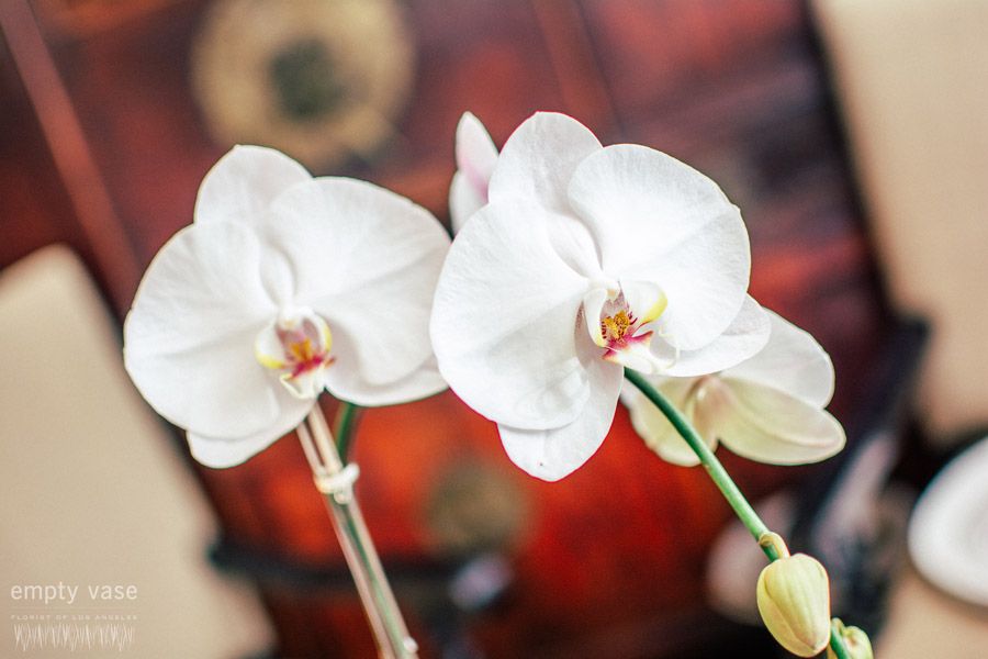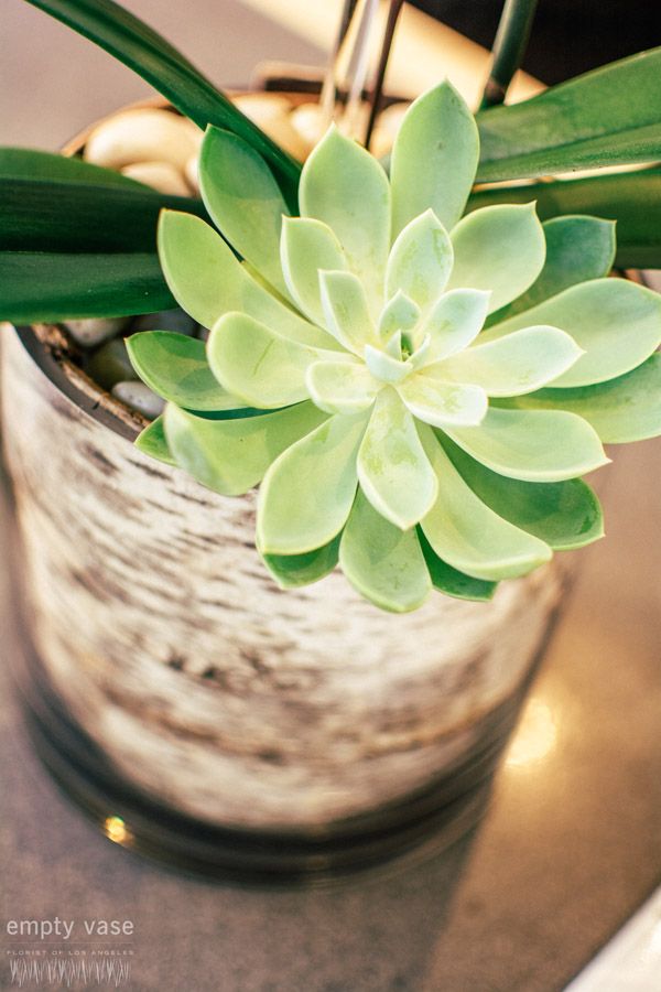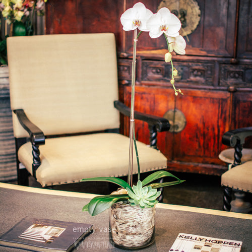 This plant features a single stem of luxurious white phalaenopsis orchids accented by a plush succulent. Resting in a 7” glass cylinder lined with birch wood and filled with smooth river rocks, this plant is approx.. 35” tall.
