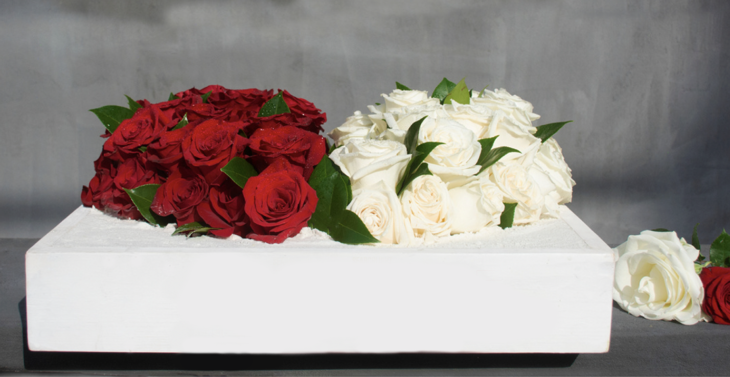 Red and white roses form two sides of a broken heart, set in a hand-painted wooden box accented by greenery and white gravel. Two warring sides collide in a contrasting color palette, subverting a classic symbol of romance and true love.