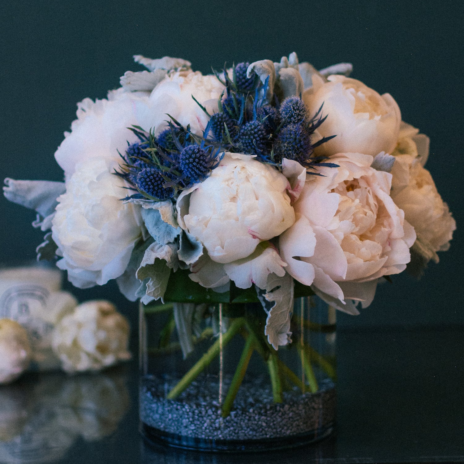 Vibrant, uniquely textured blue thistle draws a stark contrast against ten perfectly ruffled winter white peonies in full bloom. Silvery grey dusty miller leaves perfectly compliment this cool toned design, with the stems exposed from within the 6" by 6" glass vase on a bed of SILVER gravel. The Winter Thistle stands at approximately 12" tall overall.