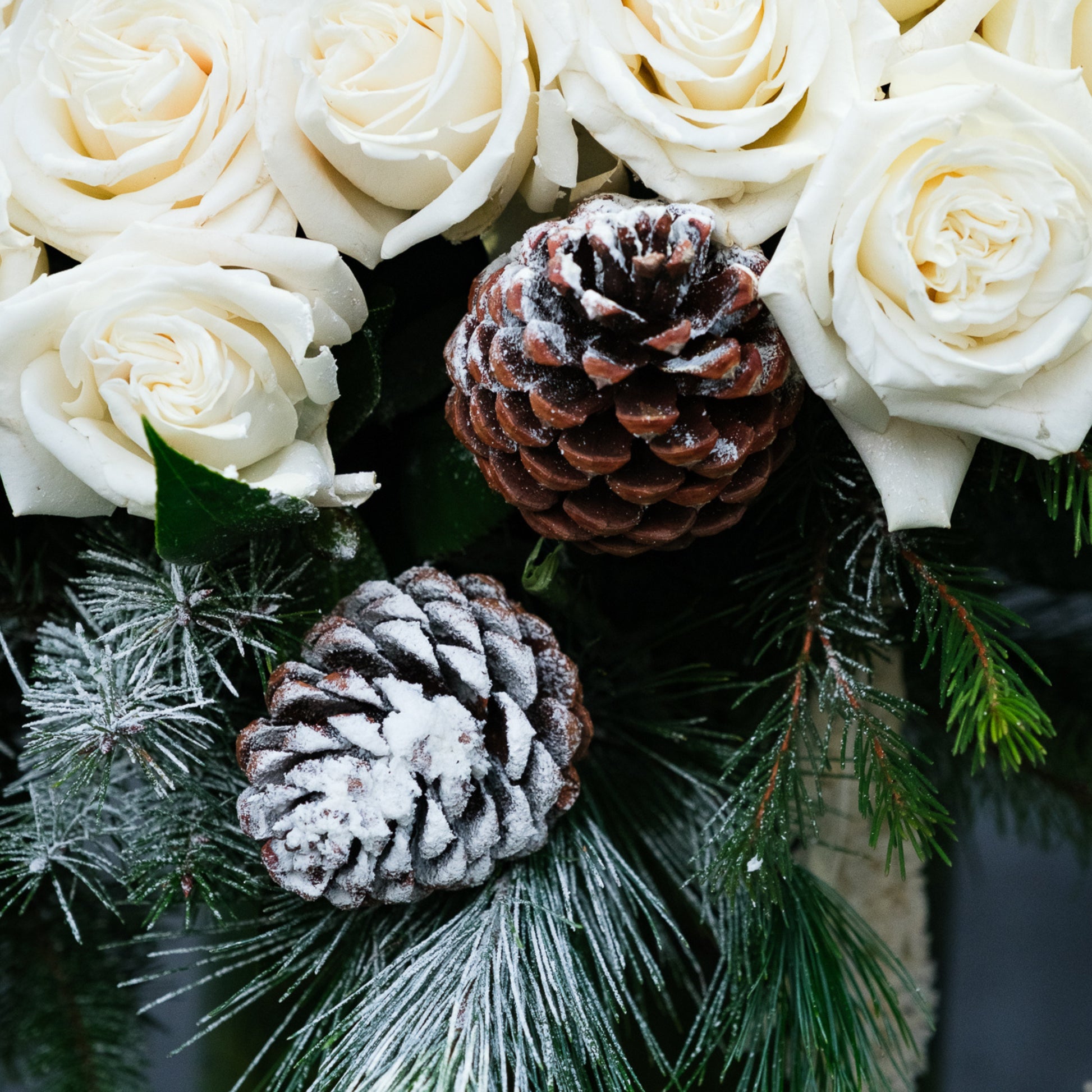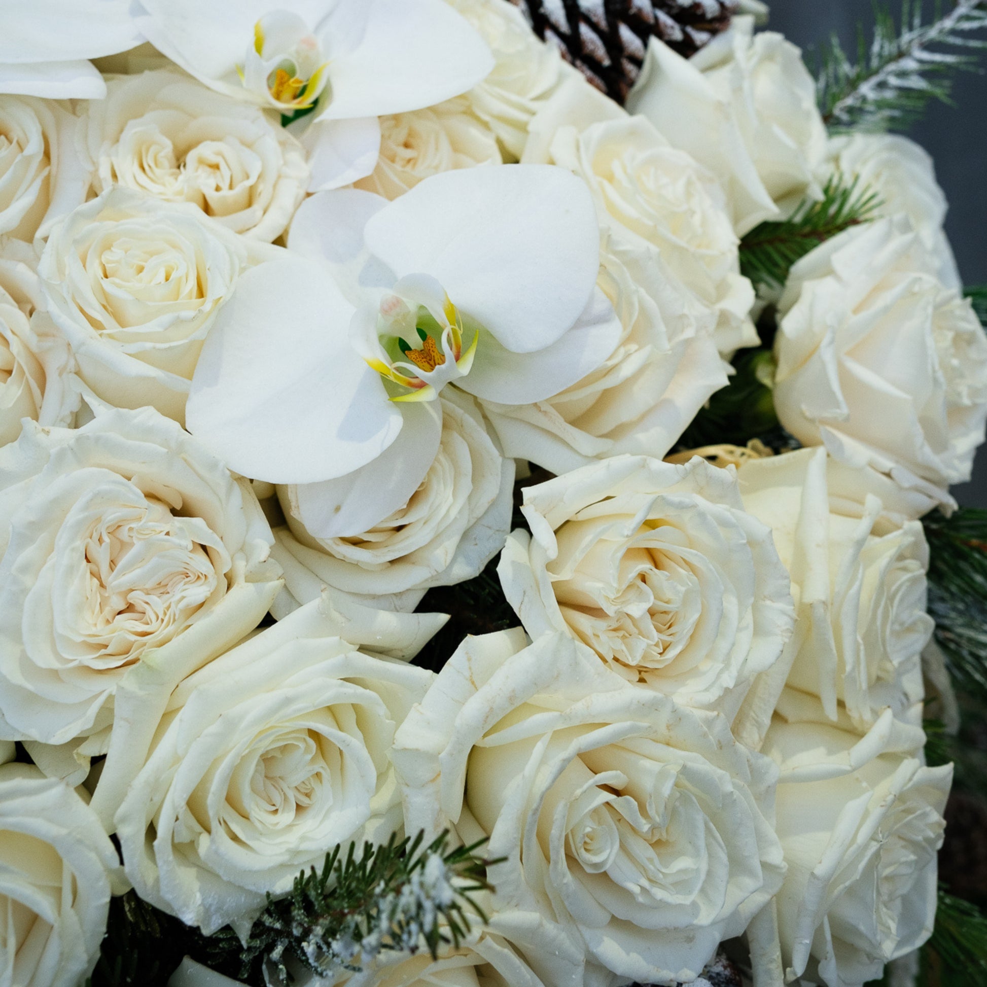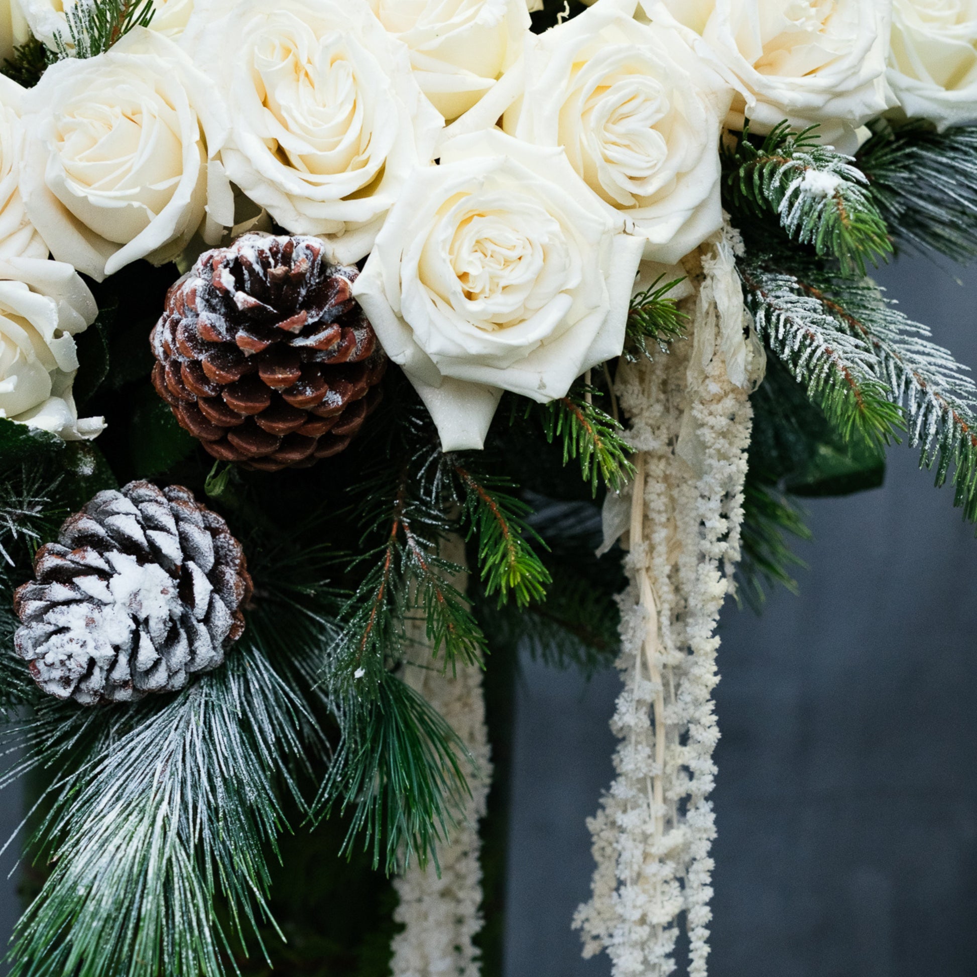 At its core, the composition features a clouded canopy of premium white roses, 50 roses in the Petite version and 75 roses in the Grande version, creating a full, domed silhouette with soft curvature and tonal depth. Woven between the blooms, iced pinecones and frosted winter greenery introduce cool texture and natural contrast. Cascading ivory amaranthus drapes along one side, adding movement and elegance, while hints of phalaenopsis orchid blooms.